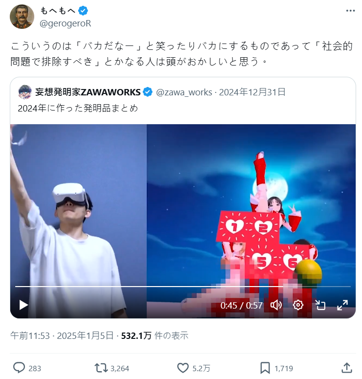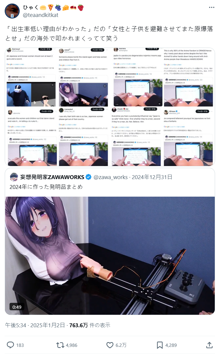 他在去年年底發布了自己 2024 年的創作總集影片,這則影片包含「胸部鍵盤」、「戳胸部遊戲」、「VR打屁屁」、「指紋認證內衣解鎖器」等,當然這些東西都符合他所謂的「思春期妄想」的發明,這些怪點子也獲得不少關注。
