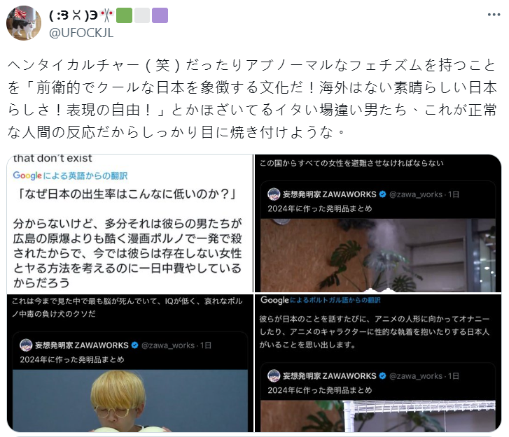也有日本網友認為那些把「變態文化(笑)」或異常癖好當成「前衛又酷的日本文化象徵!這是海外沒有的超棒日本特色!表現自由的代表!」的人,希望可以認清,這才是正常人應有的反應。