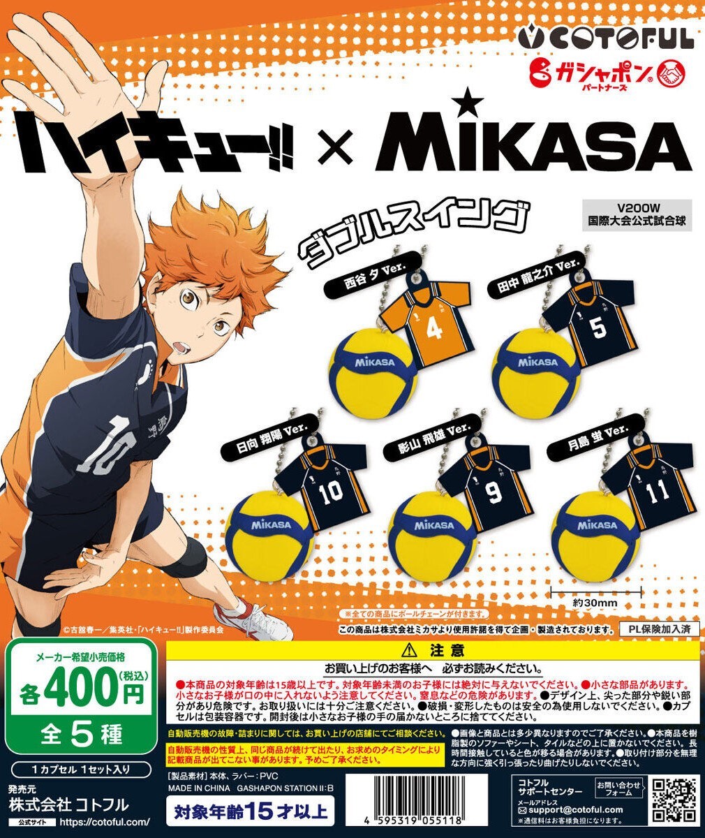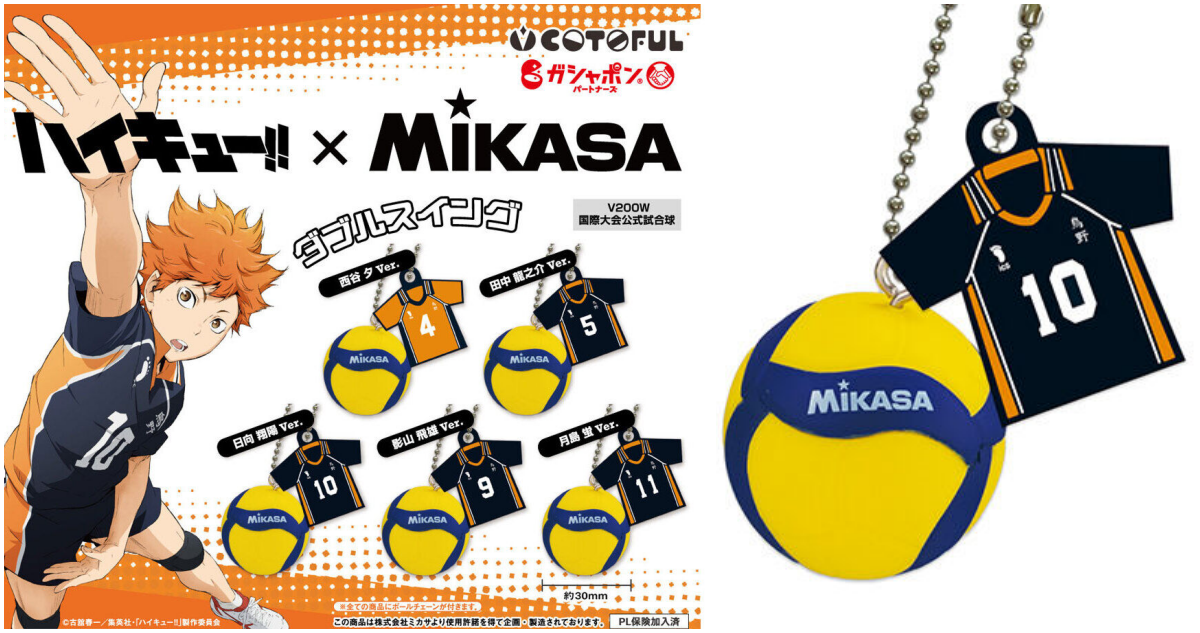 GASHAPON『排球少年!!×MIKASA 排球&制服雙吊飾』轉蛋,將 MIKASA 的 V200W 官方國際比賽用球(国際大会公式試合球)以小尺寸轉蛋化,另外每顆球都附屬有橡膠材質的制服吊飾,收錄有:翔陽 日向 ver.、影山飛雄 ver.、月島圭 ver.、田中龍之介 ver.、西谷優 ver.,排球鮮豔的黃藍配色與精緻印刷搭配角色制服吊飾,掛在包包上超可愛~