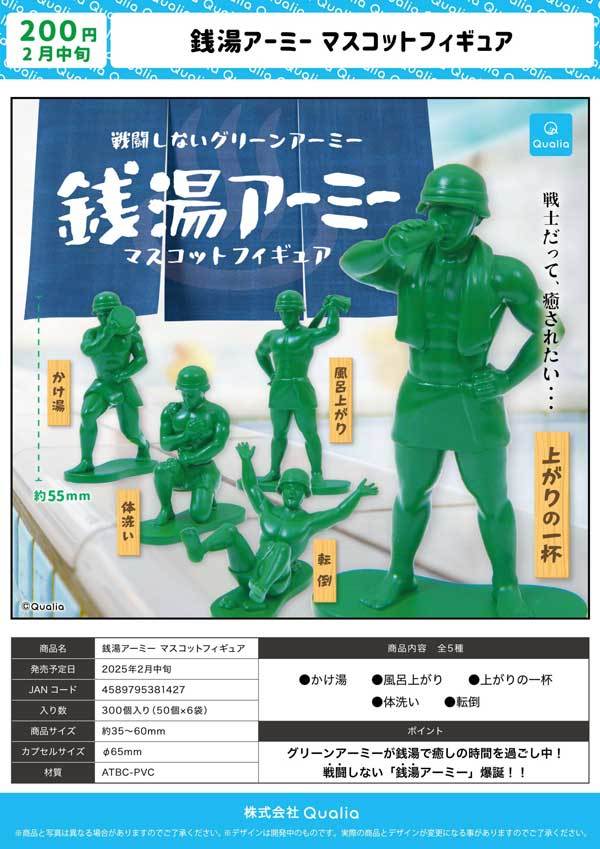 日本轉蛋玩具廠牌 Qualia 將在 2025 年 2 月中旬發售一款讚讚的綠色小兵主題轉蛋「錢湯綠兵軍團」(暫譯,銭湯アーミー マスコットフィギュア)!建議售價為每轉 200 日幣,一共有五種款式可以收集。