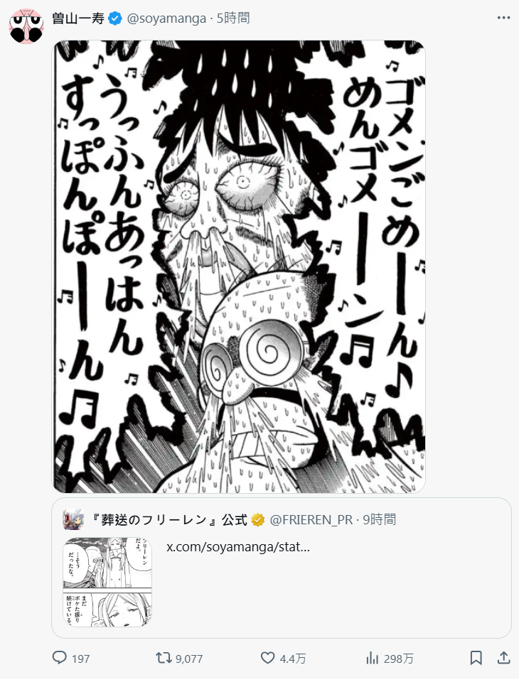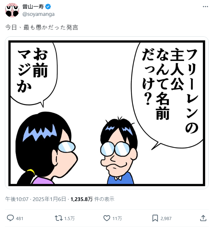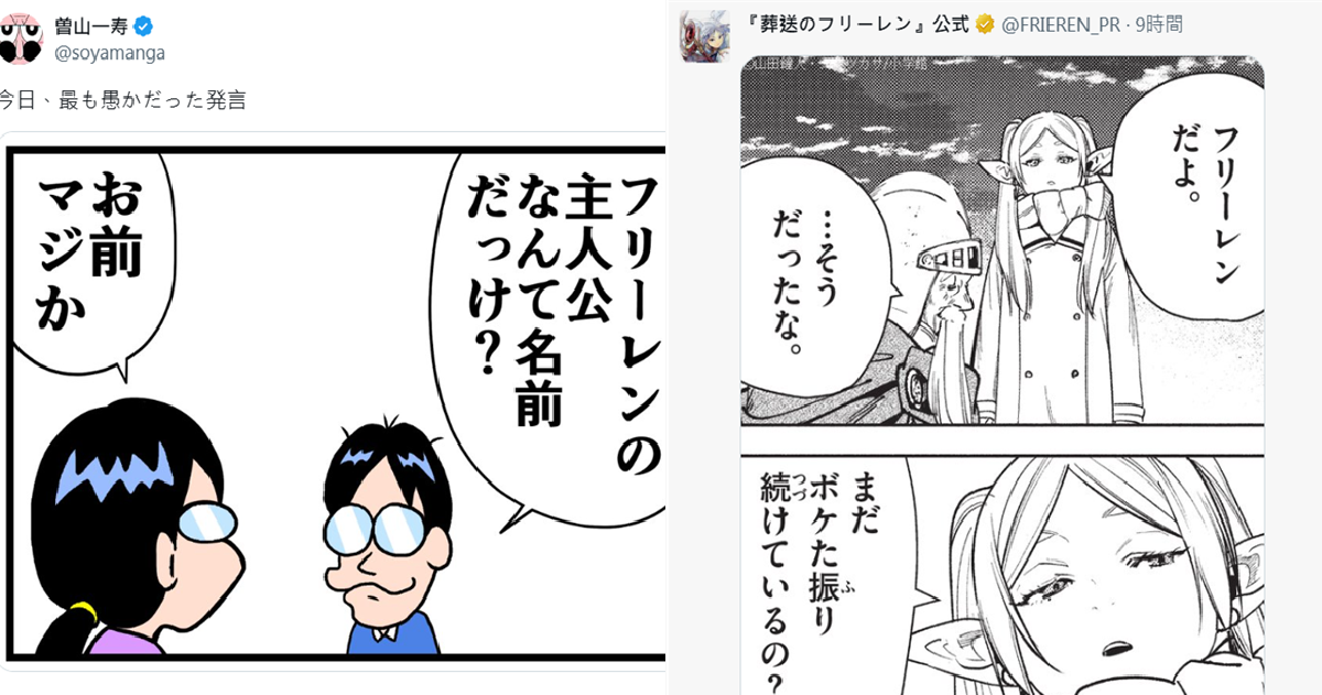 沒想到近日,日本資深搞笑漫畫家曾山一壽居然在 X 上貼文,表示自己居然問出「芙莉蓮的主角是誰啊...」這個極其愚蠢的問題,立刻引起網友們關注,甚至連《葬送的芙莉蓮》的官方帳號都來關注,成為趣味話題。