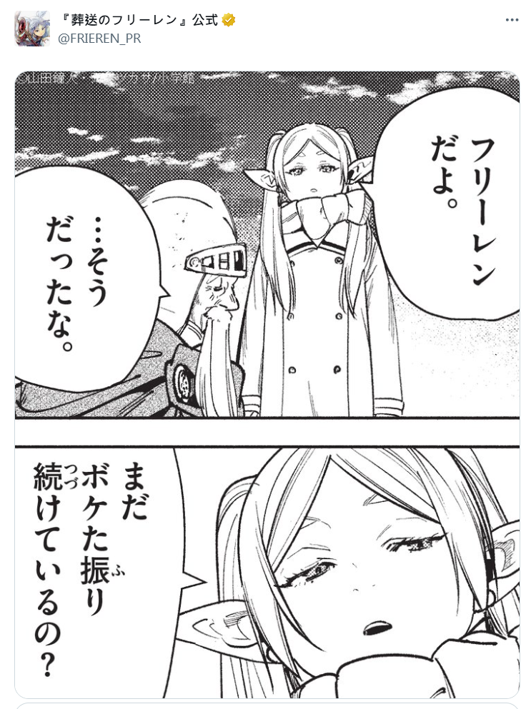 結果今日 ( 1/7 ),連《葬送的芙莉蓮》的官方 X 都引用轉推吐槽,用上漫畫中的對話「是芙莉蓮喔。」、「是這樣子阿...」、「你還要繼續裝傻嗎 ?」。這趣味的社群互動更是讓網友們爆笑,官方真的太會挑圖了 XD。