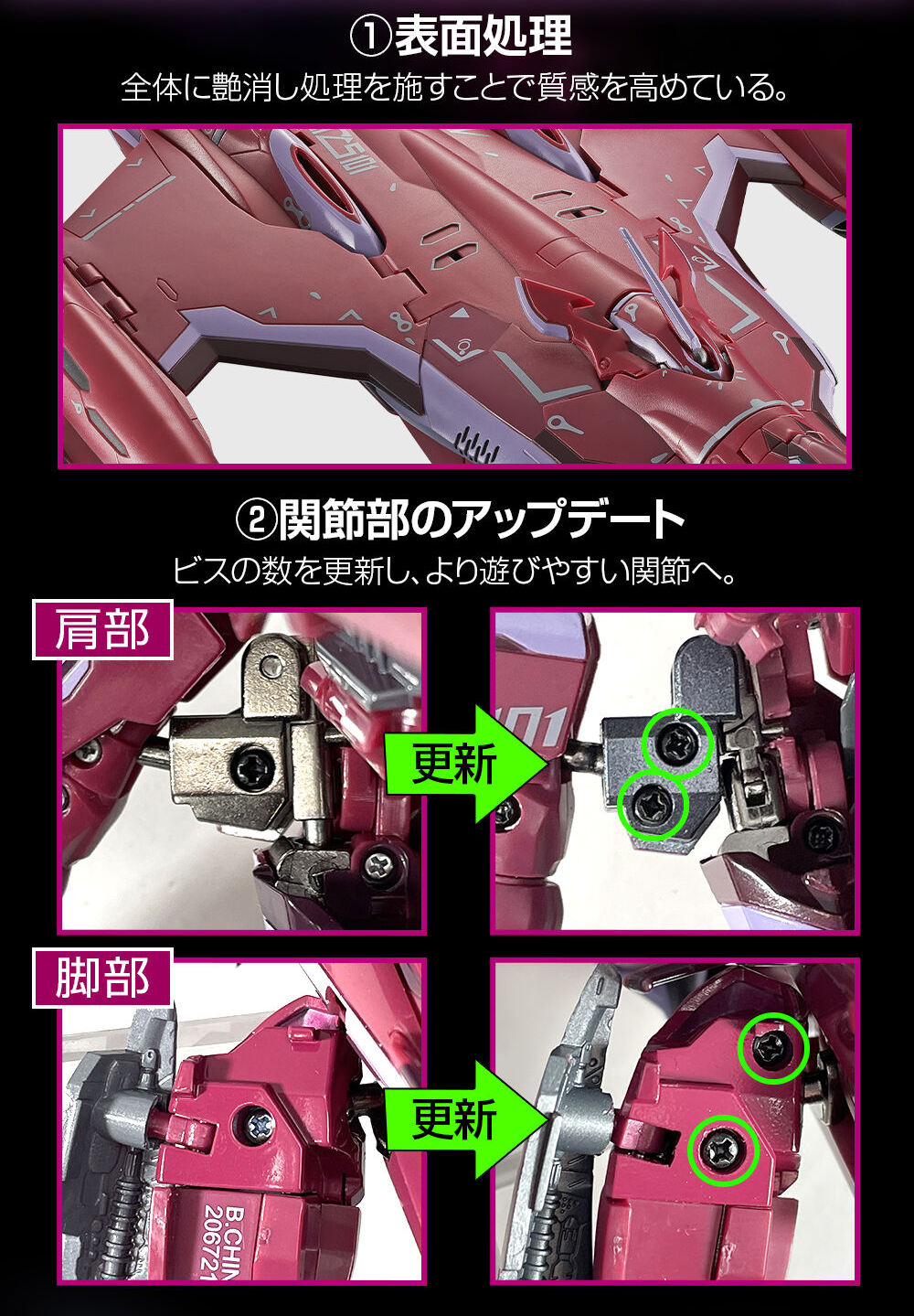 除了光束 GUNPOD、盾牌、盾牌內可伸縮的格鬥用短刀外,配件中也附上各部增設裝甲、增設大型推進器等一整套「超級零件」,能夠對應 FIGHTER、GERWALK、BATTROID 三形態進行換裝,來再現劇場版最終決戰時的帥氣造型!