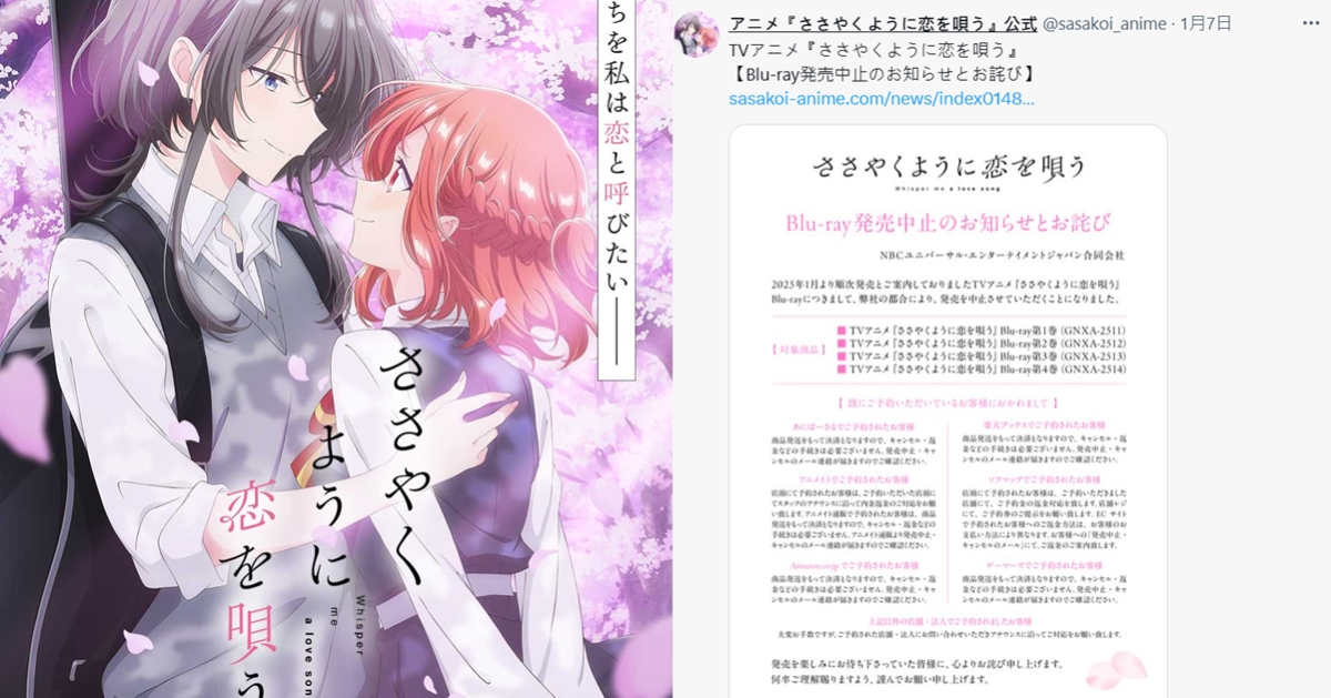 雖說動畫製作市場在 2023 年統計創下歷史新高,但是實際上仍有製作方無力承擔製作的情況。竹嶋えく創作的漫畫《恰如細語般的戀歌》(ささやくように恋を唄う),其改編動畫 2024 年 4 月起開播後,經常出現作畫崩壞場面,更因製作排程等因素停播多次,近日更直接宣布終止發售 BD 藍光的消息,引起不少粉絲怨聲載道。