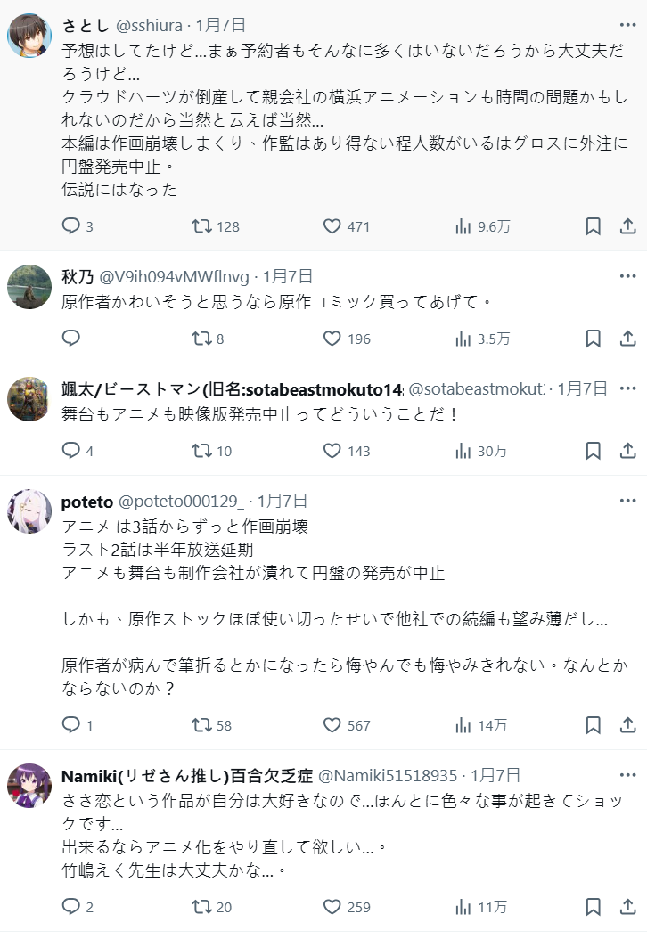 不少粉絲也替原作者竹嶋えく打抱不平,改編的動畫跟舞台劇都因為製作方搞成這副德性,不少人都是因為原作才追起來,沒想到全部倒成一片,到底製作方是用什麼心態處理承接的製作。