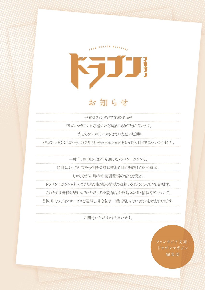 《Dragon Magazine》編輯部也說明了休刊的原因:「在 2023 年慶祝創刊 35 周年後,我們感受到讀者閱讀習慣的改變,紙本雜誌已無法完全承載《Dragon Magazine》過去的角色與使命。因此,我們決定以新的形式提供媒體服務,期待大家支持全新的挑戰!」
