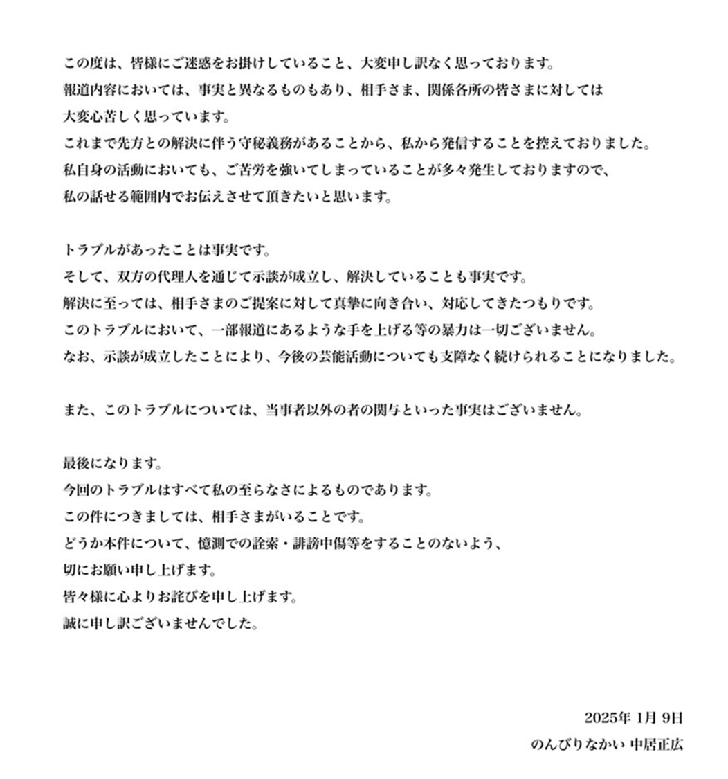 關於近日報導中提及的女性相關糾紛,我中居正廣深感抱歉,向所有受到困擾的各位致上誠摯的歉意。以下是我的聲明全文。