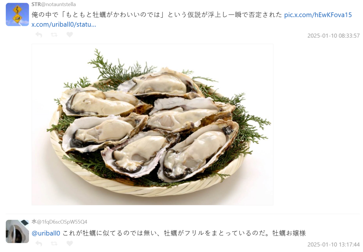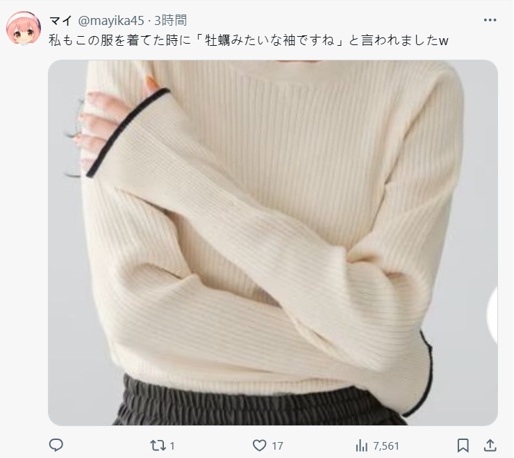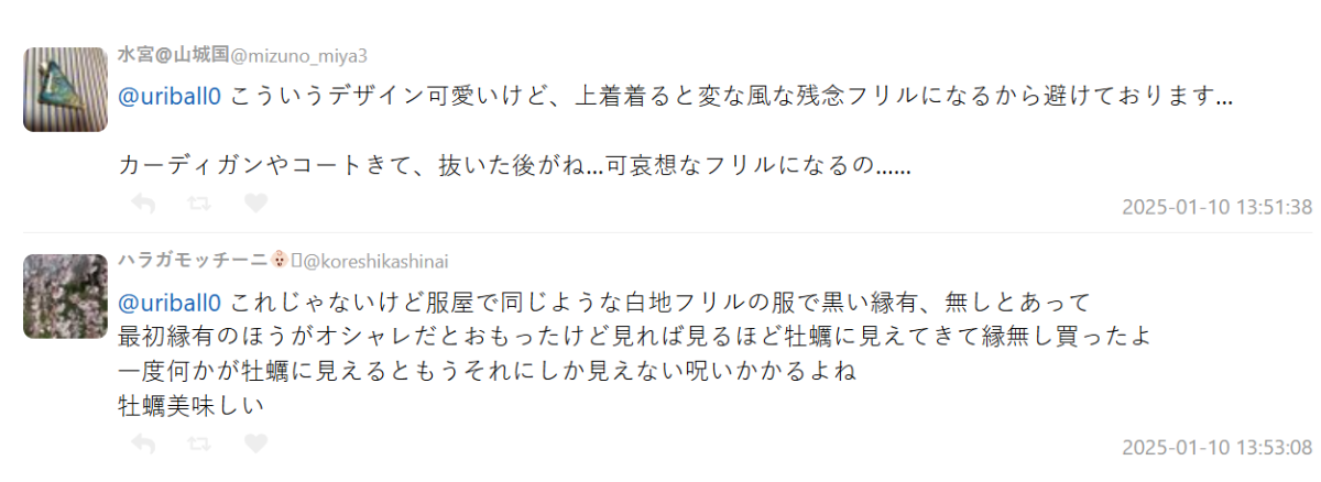 結果還有網友苦笑,腦中突然冒出一個假設:「是不是其實牡蠣本來就很可愛?」不過馬上就被自己推翻了,這比喻太毒了 www。也有網友稱說這根本不是衣服像牡蠣,而是牡蠣披上了華麗的荷葉邊啊!簡直是牡蠣大小姐本人!