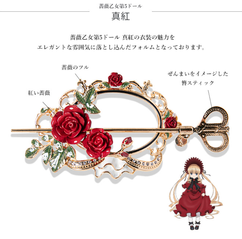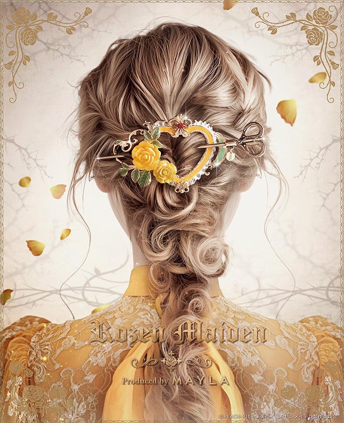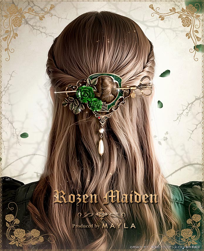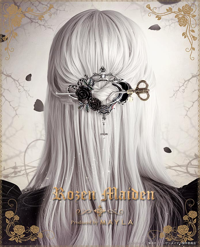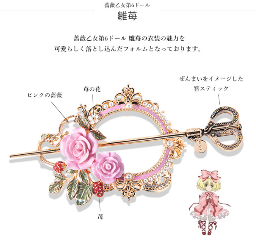 這次合作推出七位角色的髮簪,包含 : 水銀燈、金絲雀、翠星石、蒼星石、真紅、雛莓、雪華綺晶,所有薔薇少女系列七大人偶都一次推出。