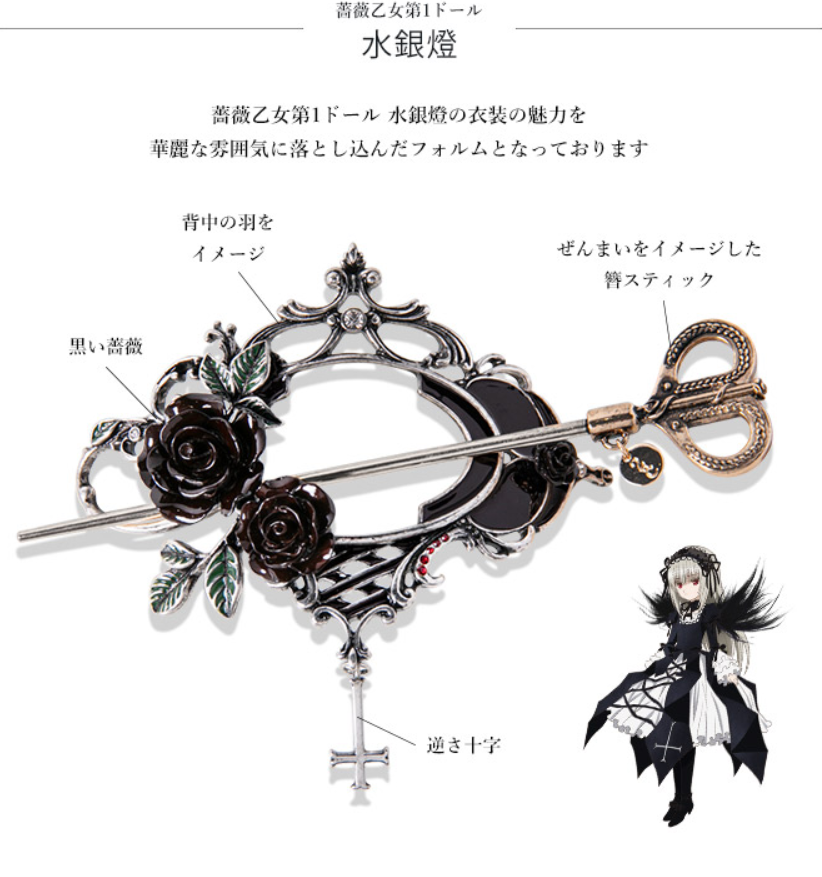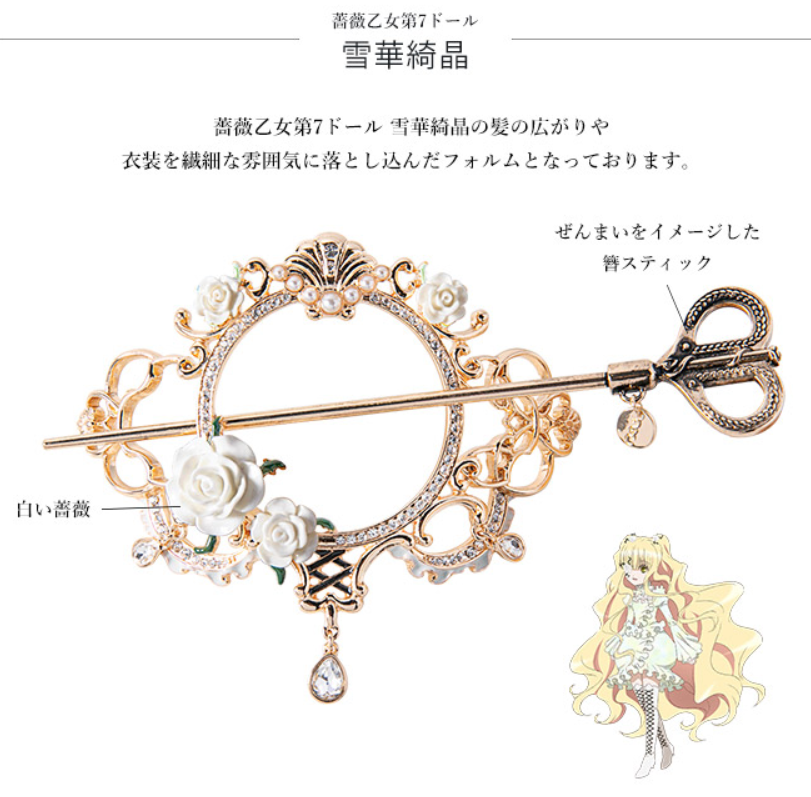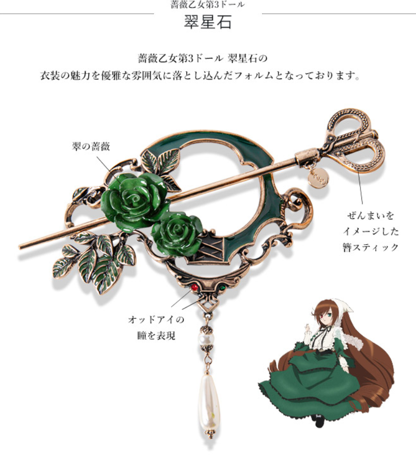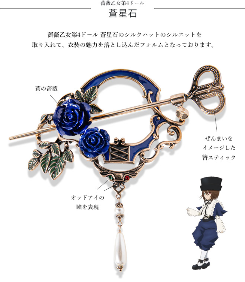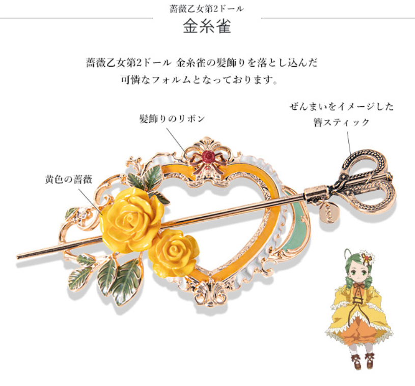 設計上採用各人偶設定的服裝與色系,還用上人偶的發條來打造,並點綴各角色的所代表的薔薇。不僅可以作為單獨的簪使用,也可與飾品組合成優雅的華麗髮飾。讓你各位推哪個都有得入手,當然全推就...一次買齊吧 XD。