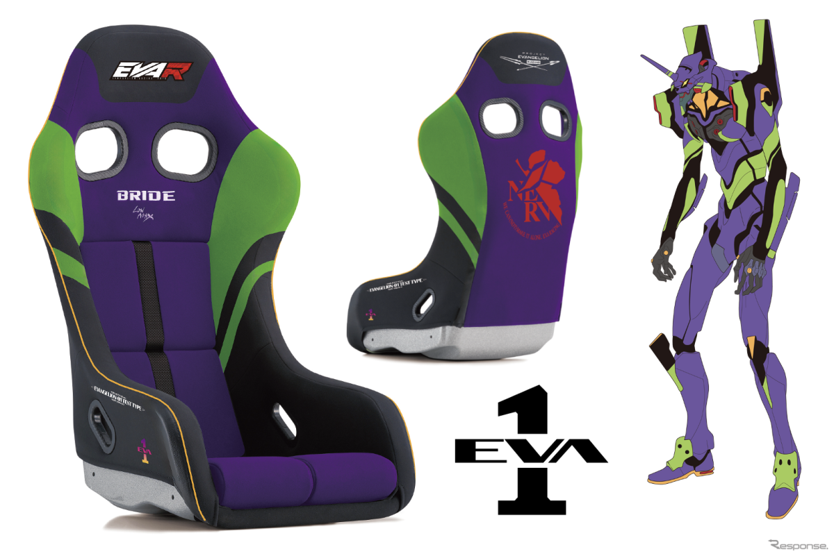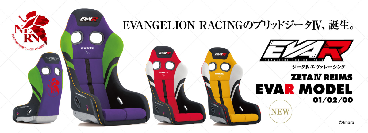 座椅採用 BRIDE 頗受好評的 ZETA IV 賽車座椅為基礎打造,可以看到以初號機、二號機與零號機色系打造,並配上「EVA-racing 」的 Logo 在上面,搭配背後招牌的「NERV」 Logo。座椅更是機能性不在話下,符合駕車時的人體工學設計能讓你開車長時間減輕疲勞,適合從普通道路到賽車運動等所有情況下使用。