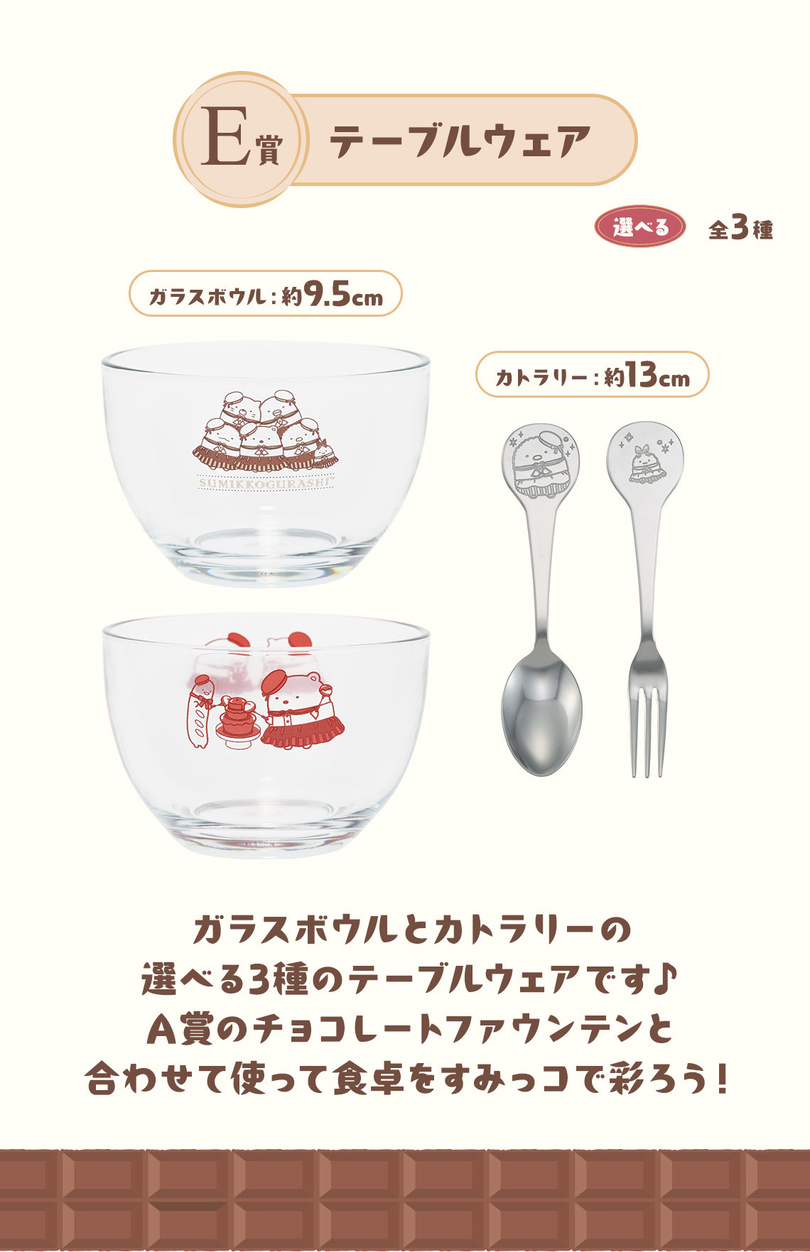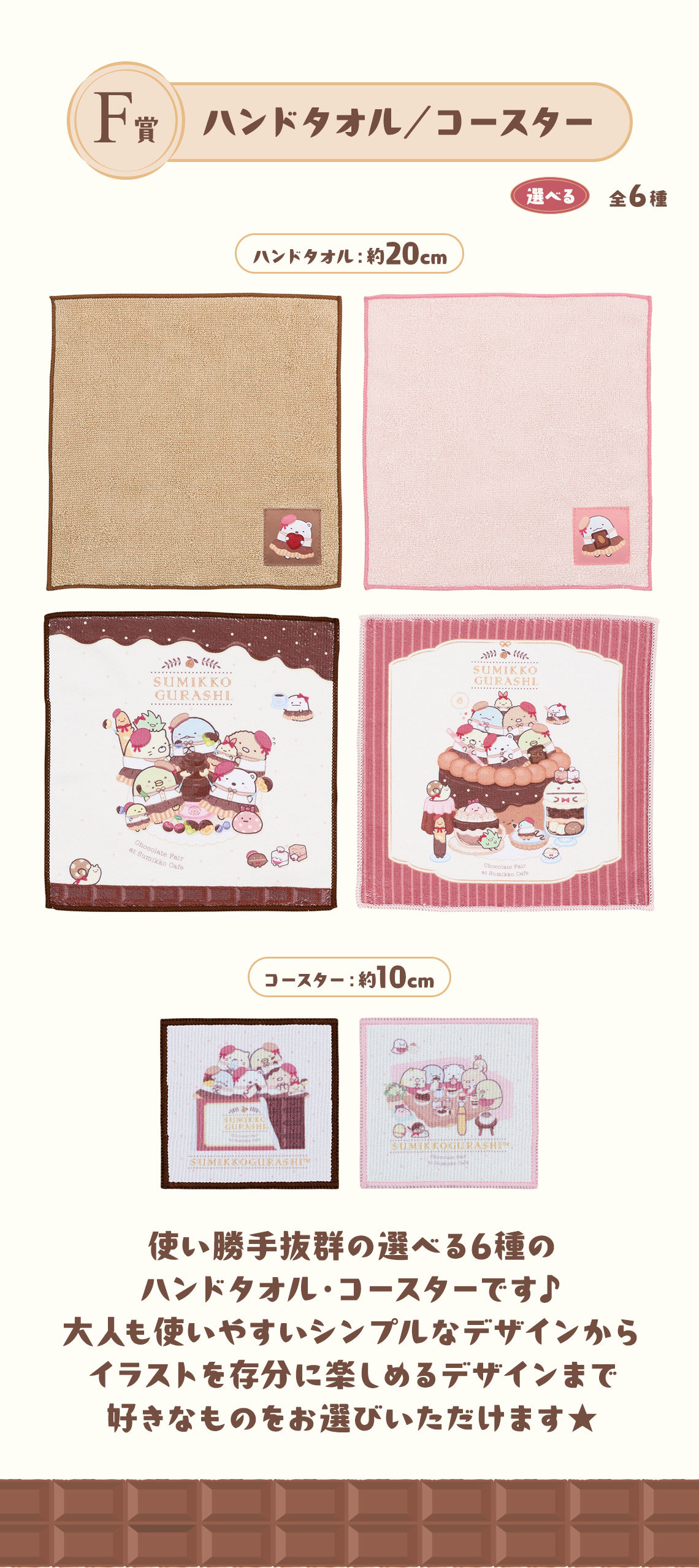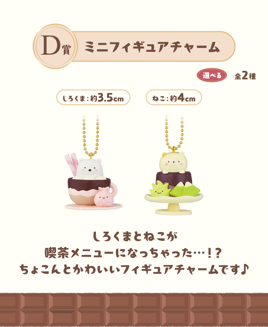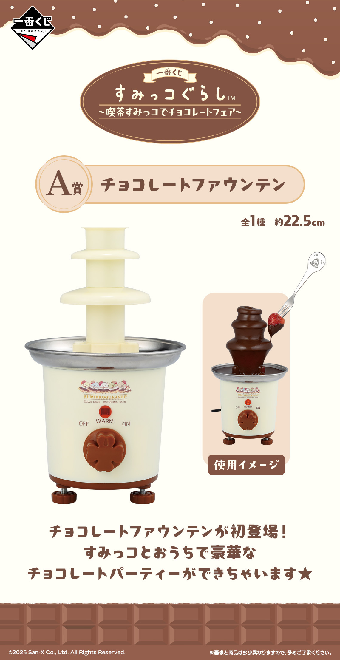 本次的「角落小夥伴~喫茶角落巧克力派對~」將以巧克力結合角落小夥伴為主題提供 A~G、最後一賞與雙重中獎賞等不同級別的賞品。A 賞與雙重中獎賞為超狂的角落小夥伴造型巧克力噴泉機,整體以這次主題的米黃色調打造,並在上面印有貓咪、蜥蜴、白熊、企鵝、炸豬排以及炸蝦尾穿著咖啡色服裝的圖樣,一邊吃粘著巧克力的水果、糖果餅乾,一邊看著可愛的角落小夥伴們感覺真是一大享受!