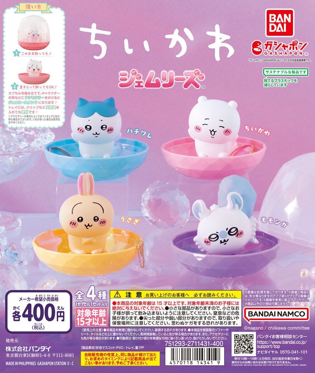 日本萬代玩具公司轉蛋玩具品牌 GASHAPON 旗下的「人偶珠寶架(ジェムリーズ)」系列,發表了以《吉伊卡哇》為主題的首彈商品:「吉伊卡哇 人偶珠寶架」轉蛋!一共有四種款式,一轉參考售價為 400 日圓,預計於 2025 年 01 月開轉。