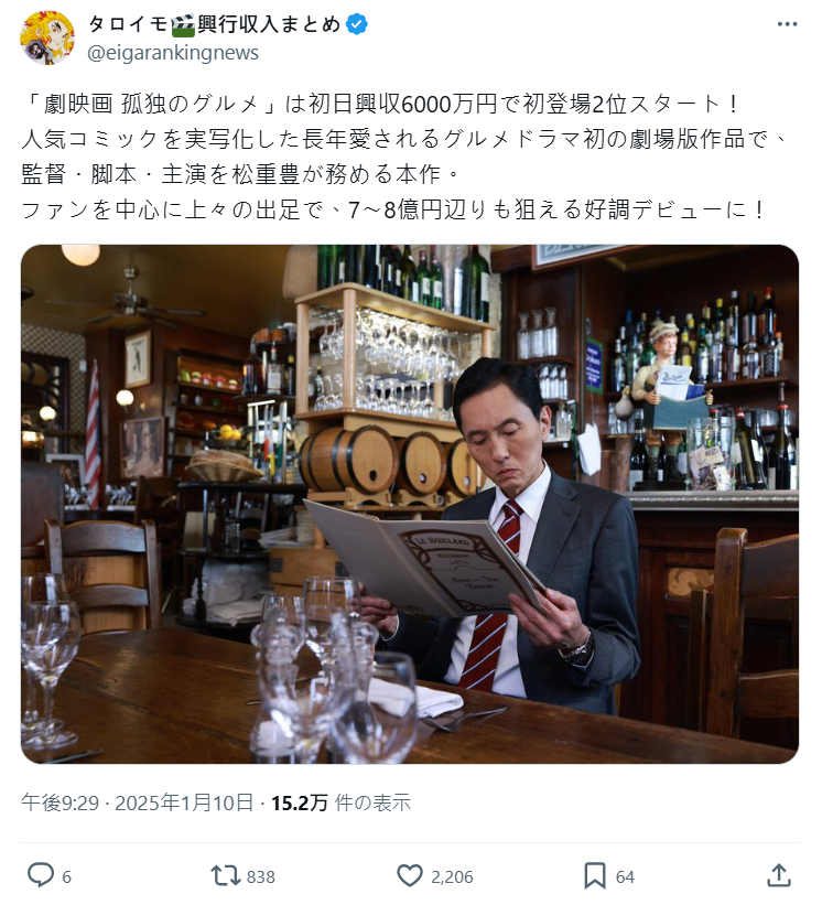 結果首日票房就突破 6000 萬日圓,僅輸給木村拓哉主演的電影版《天才主廚餐廳》,看來要退休,可沒那麼容易阿 XD。