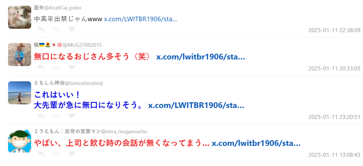 當然在居酒屋這種應酬場合,不少中高年齡人會在此聚會,網友也開玩笑說,這一貼出來應該這類人會少很多話,像是公司的前輩這種,讓居酒屋可以不要充滿這些吹噓話題。
