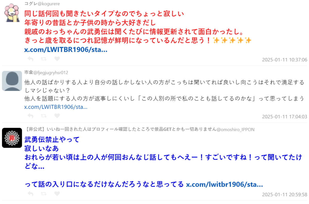 不過也有網友表示,其實這類人並沒有不好,比起那些討論他人的事務或八卦,他們吹噓自己也不傷害他人,甚至有些人真的在這種場合只會說這種話,想想如果禁止好像有點寂寞阿 ( ? )
