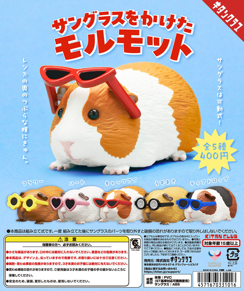 日本轉蛋玩具公司奇譚俱樂部(株式会社奇譚クラブ),將推出可愛動物系列的最新商品:「戴墨鏡的天竺鼠」轉蛋,共有五種款式,參考售價為 400 日圓,預計將於 2025 年 1 月開轉!