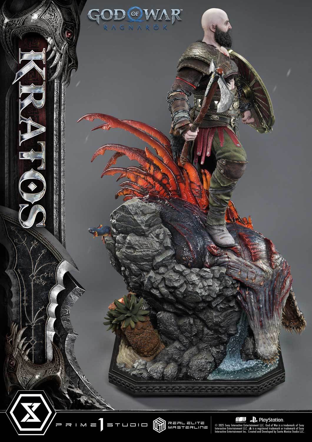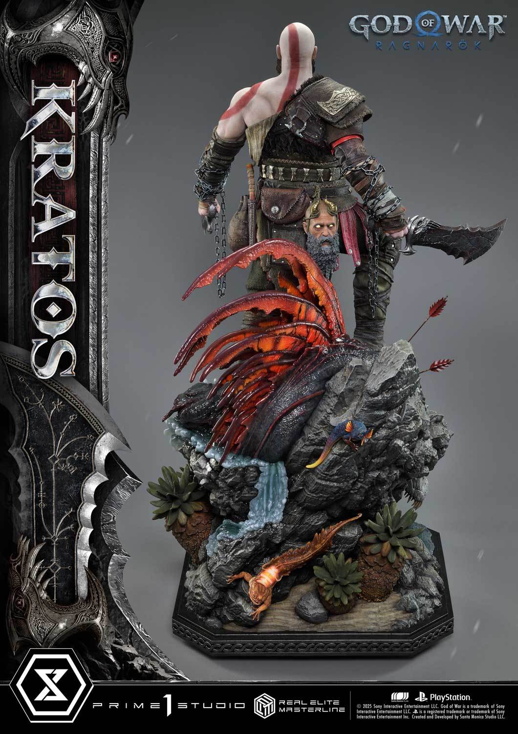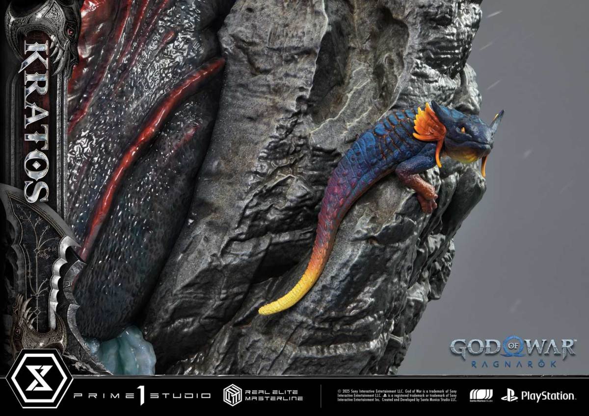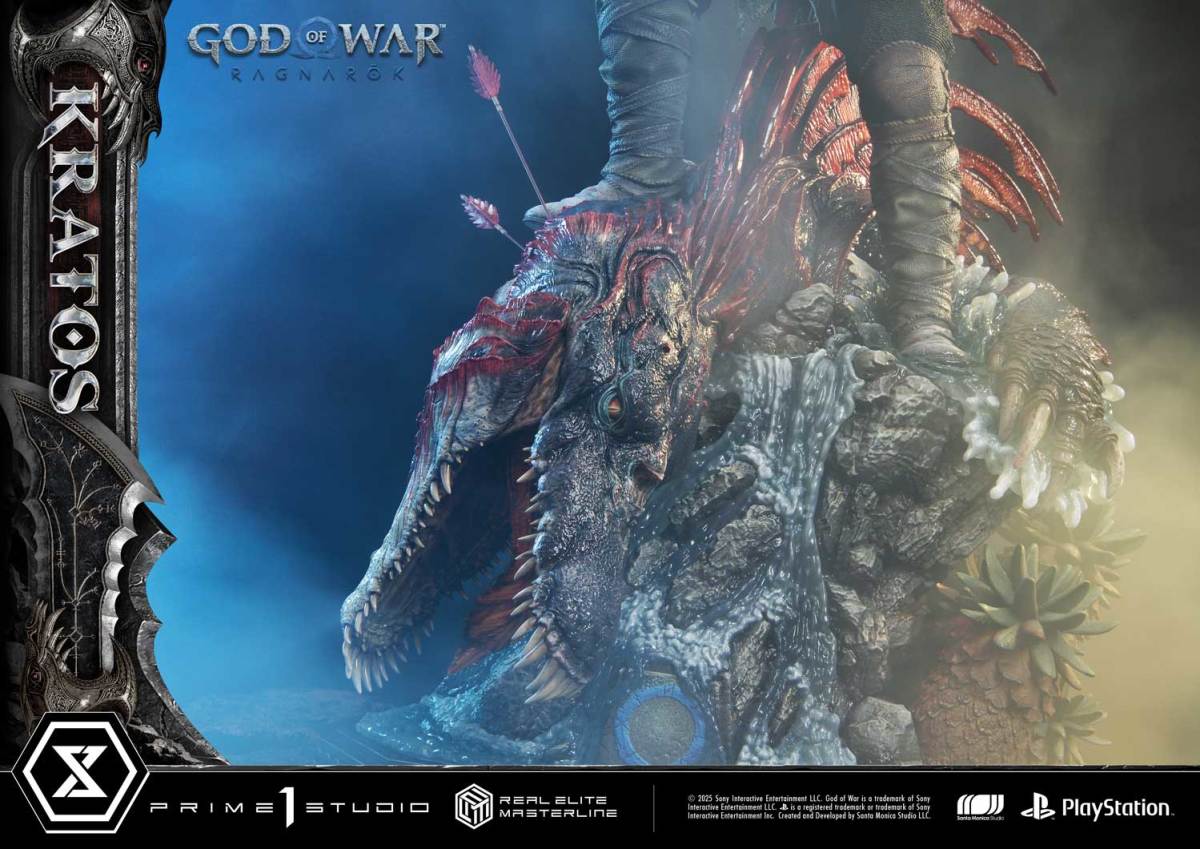 本次的克雷多斯 1/3 比例收藏雕像製作他手持利維坦之斧及守護者之盾的英姿,雕刻出他標誌性的光頭及大鬍子,以極度寫實的手法還原他在遊戲中的造型,上身精實的肌肉及鮮紅色印記都被精緻重現!服裝部分採用布料、絨布及金屬件等複合材質剪裁製作重現遊戲中甲冑、褲子及靴子的質感,身後則掛著眼睛做有 LED 發光功能的密米爾,超寫實還原頭顱上的皺紋、紋身等造型!