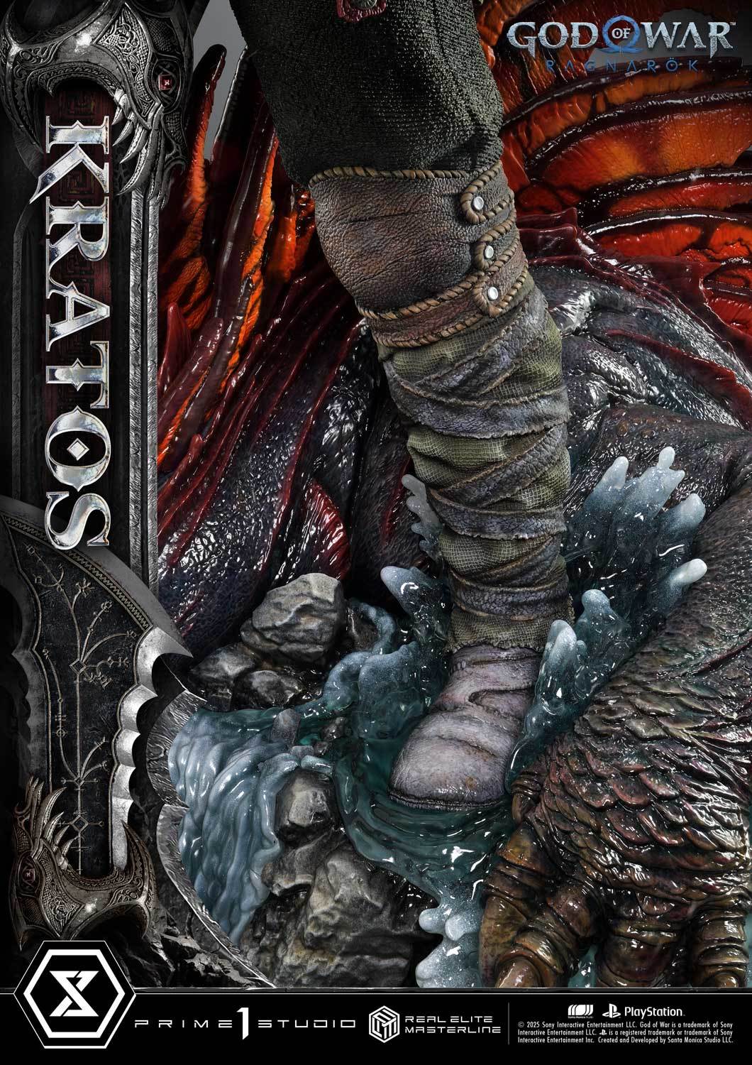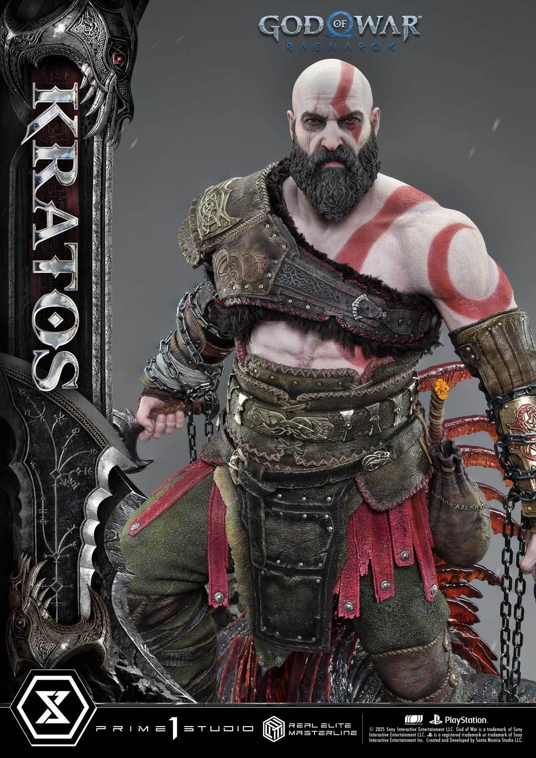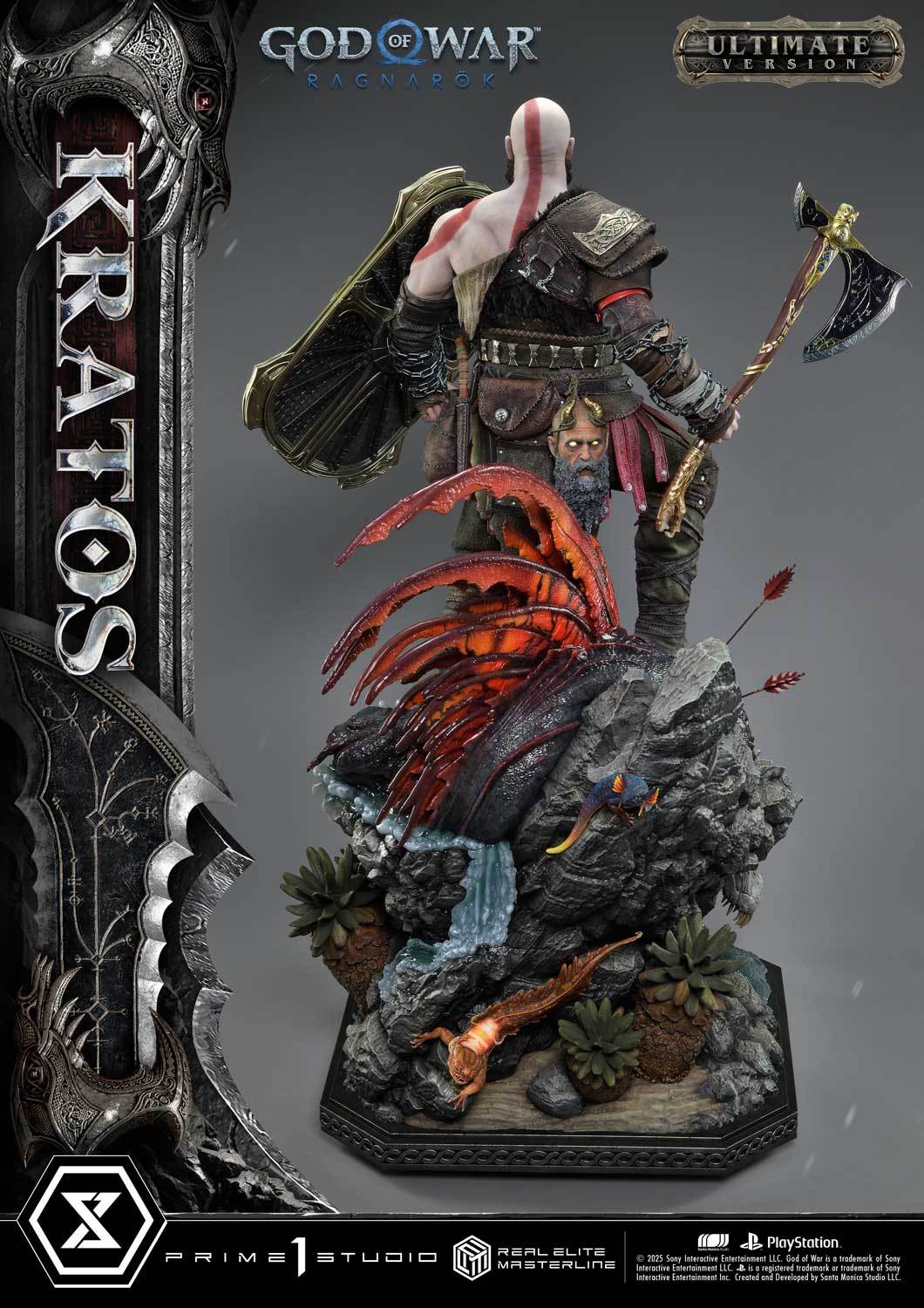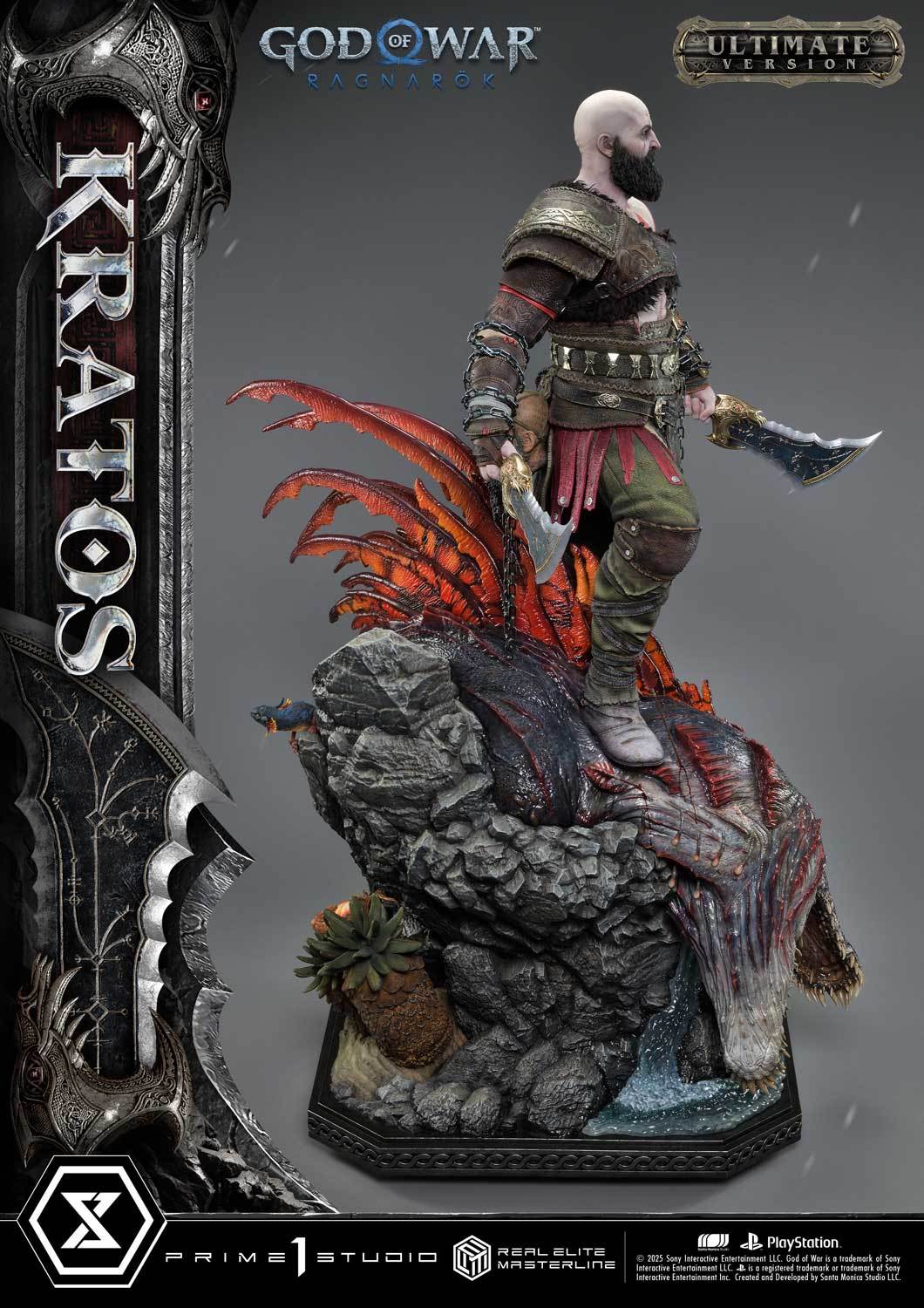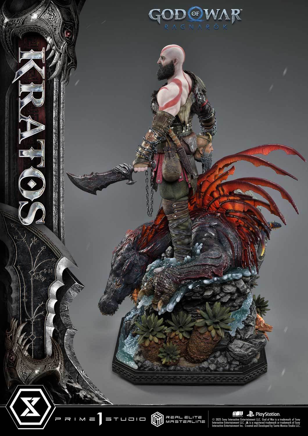 本次的克雷多斯 1/3 比例收藏雕像製作他手持利維坦之斧及守護者之盾的英姿,雕刻出他標誌性的光頭及大鬍子,以極度寫實的手法還原他在遊戲中的造型,上身精實的肌肉及鮮紅色印記都被精緻重現!服裝部分採用布料、絨布及金屬件等複合材質剪裁製作重現遊戲中甲冑、褲子及靴子的質感,身後則掛著眼睛做有 LED 發光功能的密米爾,超寫實還原頭顱上的皺紋、紋身等造型!