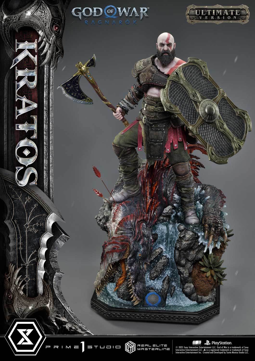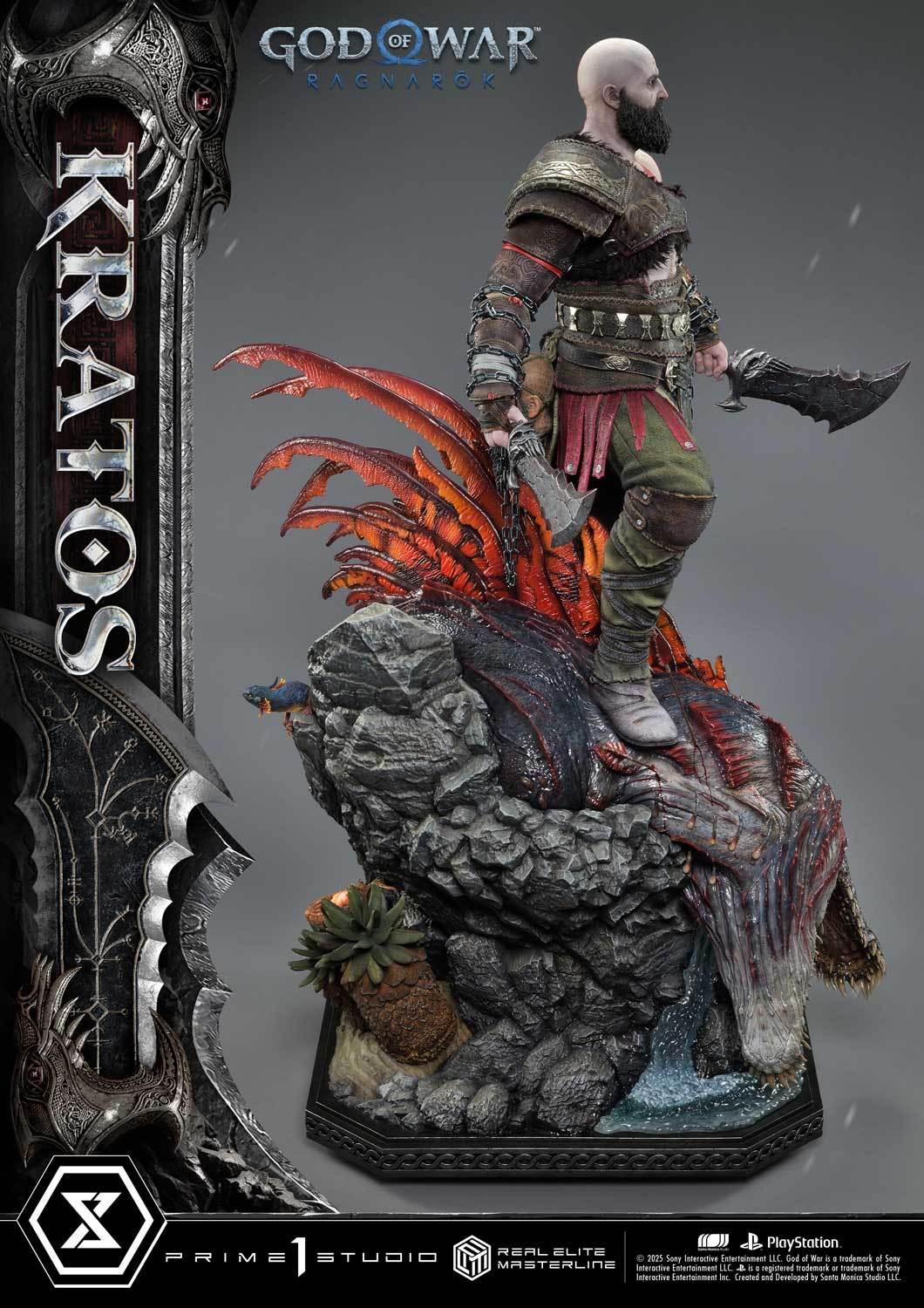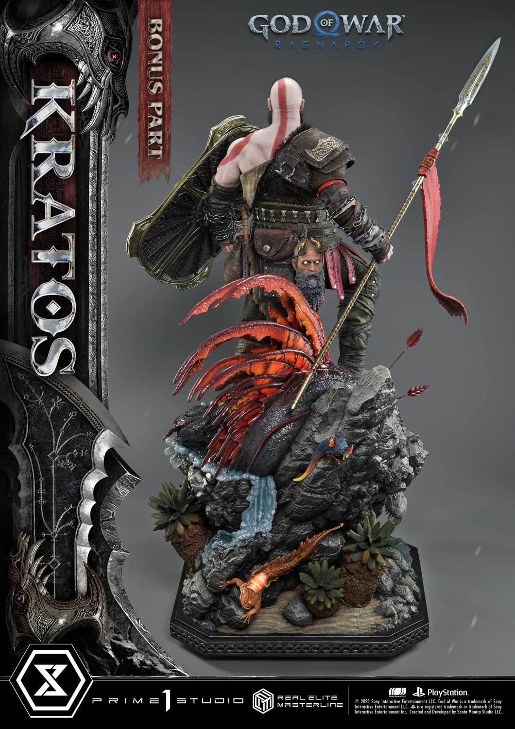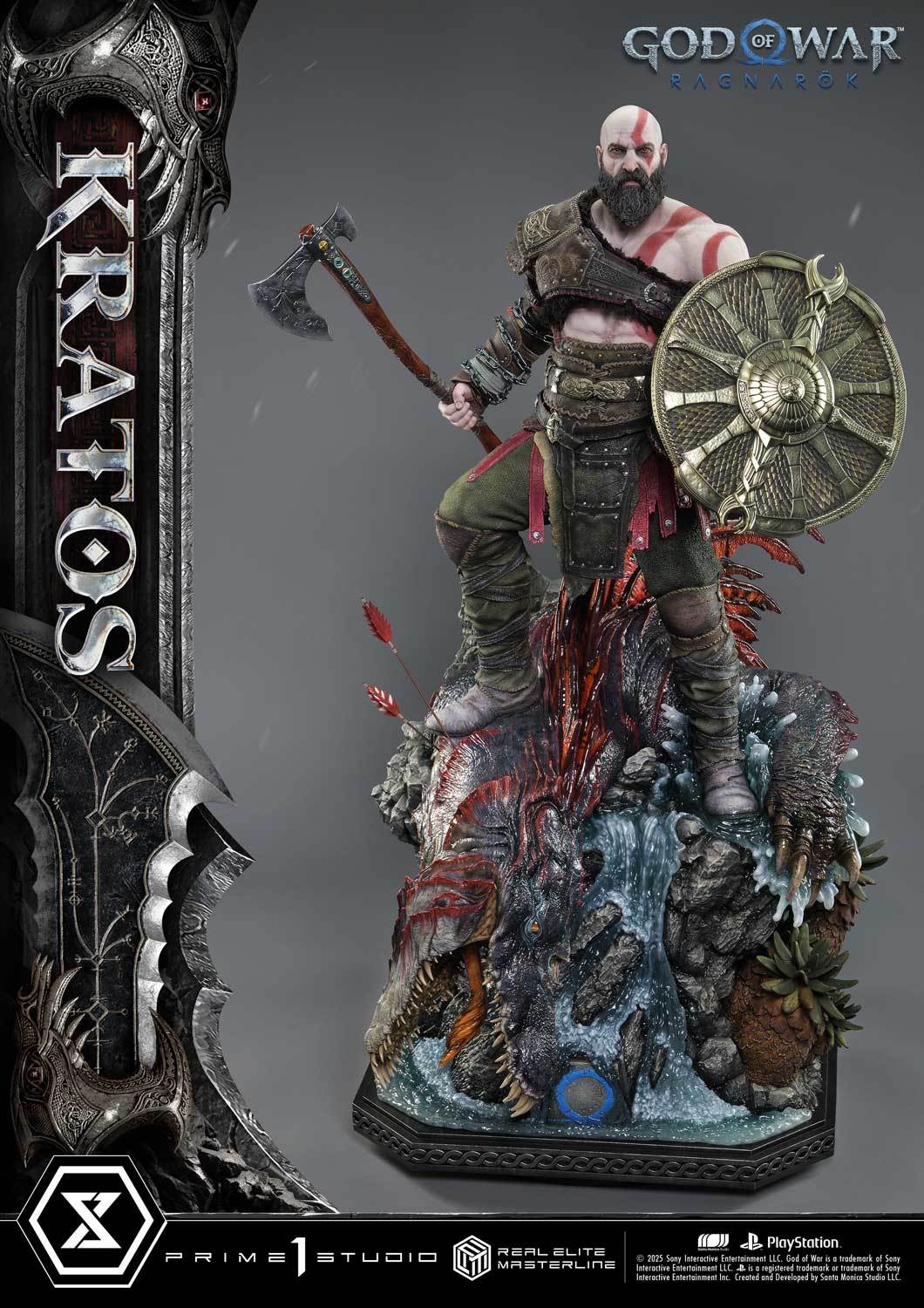本次的克雷多斯 1/3 比例收藏雕像製作他手持利維坦之斧及守護者之盾的英姿,雕刻出他標誌性的光頭及大鬍子,以極度寫實的手法還原他在遊戲中的造型,上身精實的肌肉及鮮紅色印記都被精緻重現!服裝部分採用布料、絨布及金屬件等複合材質剪裁製作重現遊戲中甲冑、褲子及靴子的質感,身後則掛著眼睛做有 LED 發光功能的密米爾,超寫實還原頭顱上的皺紋、紋身等造型!