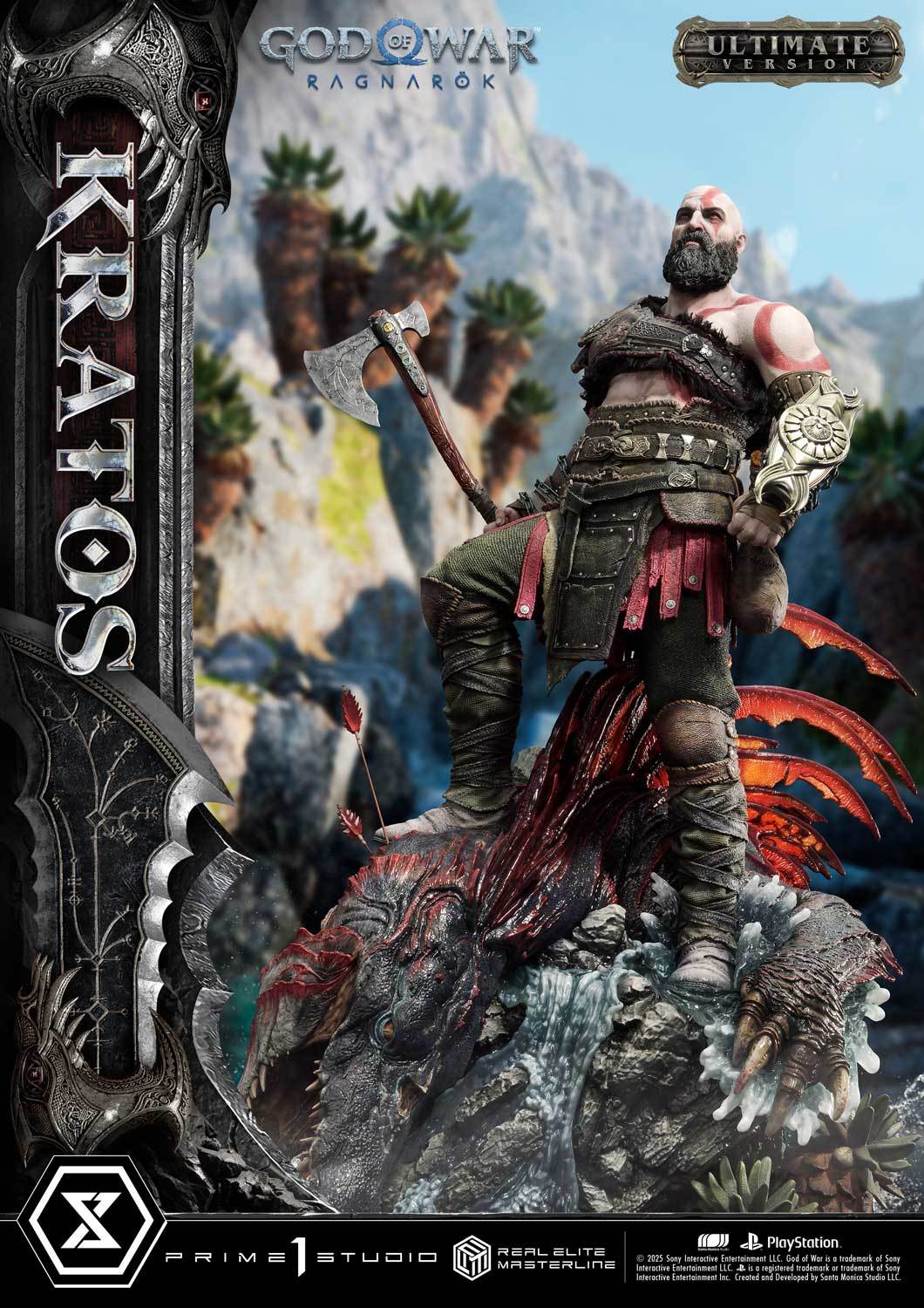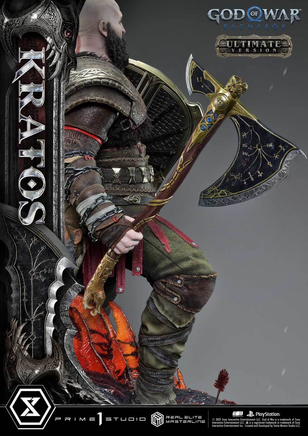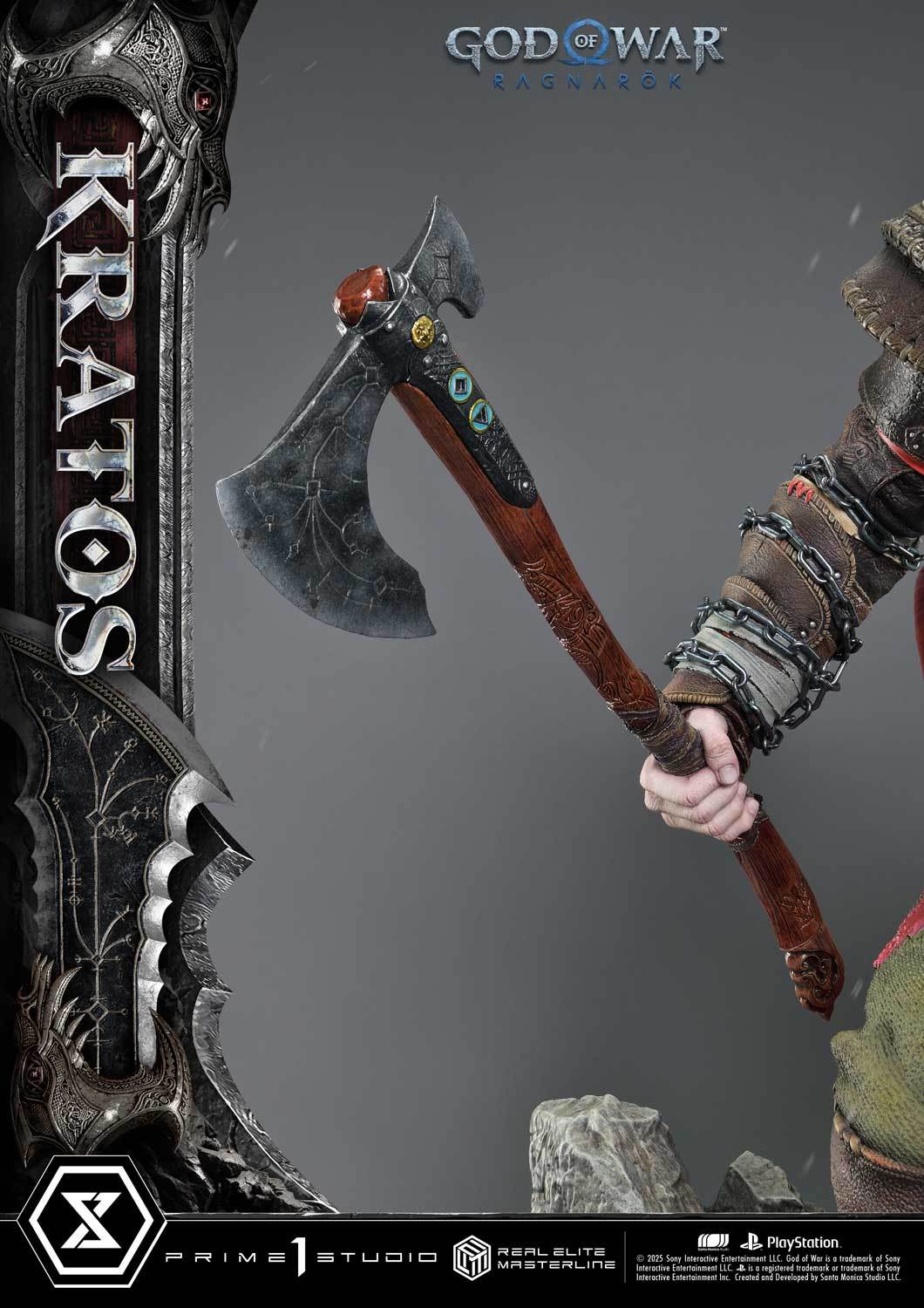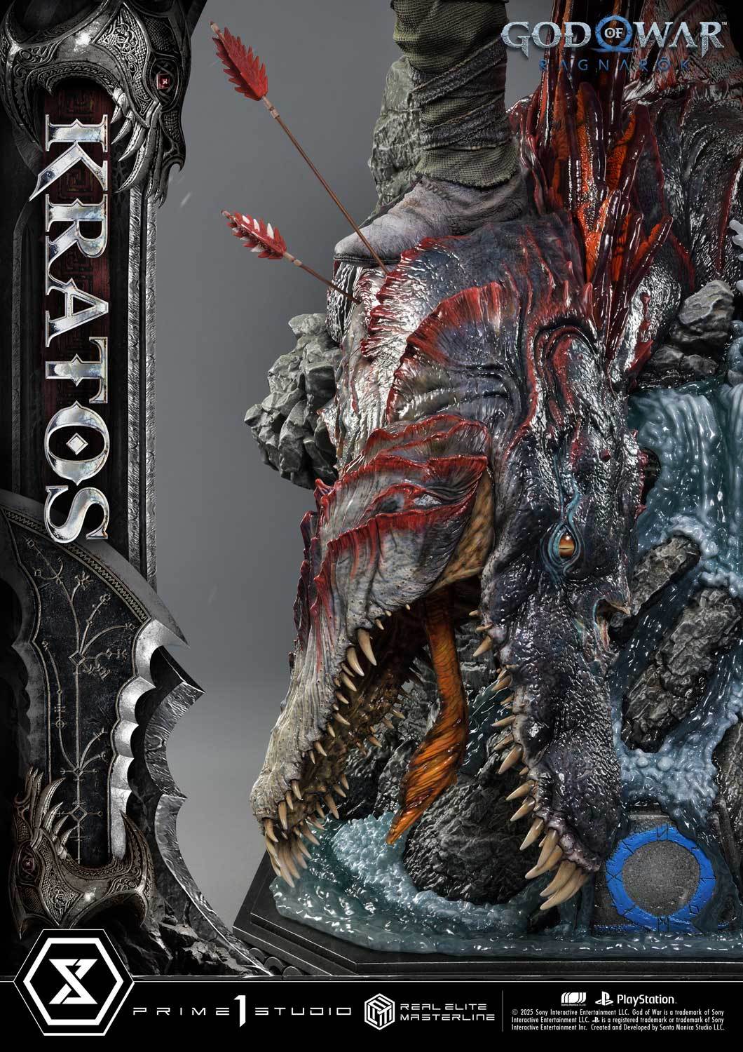 本次的克雷多斯 1/3 比例收藏雕像製作他手持利維坦之斧及守護者之盾的英姿,雕刻出他標誌性的光頭及大鬍子,以極度寫實的手法還原他在遊戲中的造型,上身精實的肌肉及鮮紅色印記都被精緻重現!服裝部分採用布料、絨布及金屬件等複合材質剪裁製作重現遊戲中甲冑、褲子及靴子的質感,身後則掛著眼睛做有 LED 發光功能的密米爾,超寫實還原頭顱上的皺紋、紋身等造型!