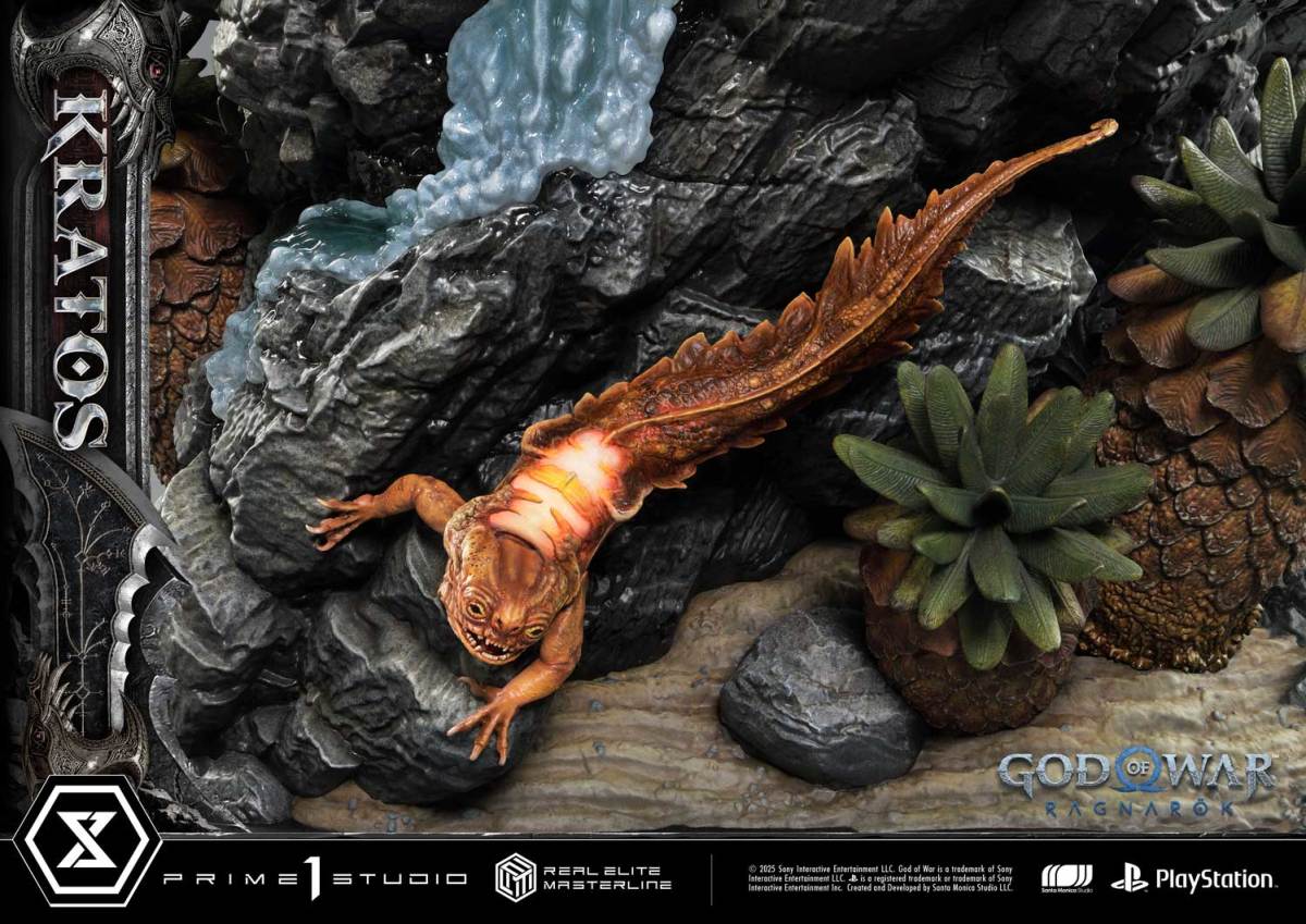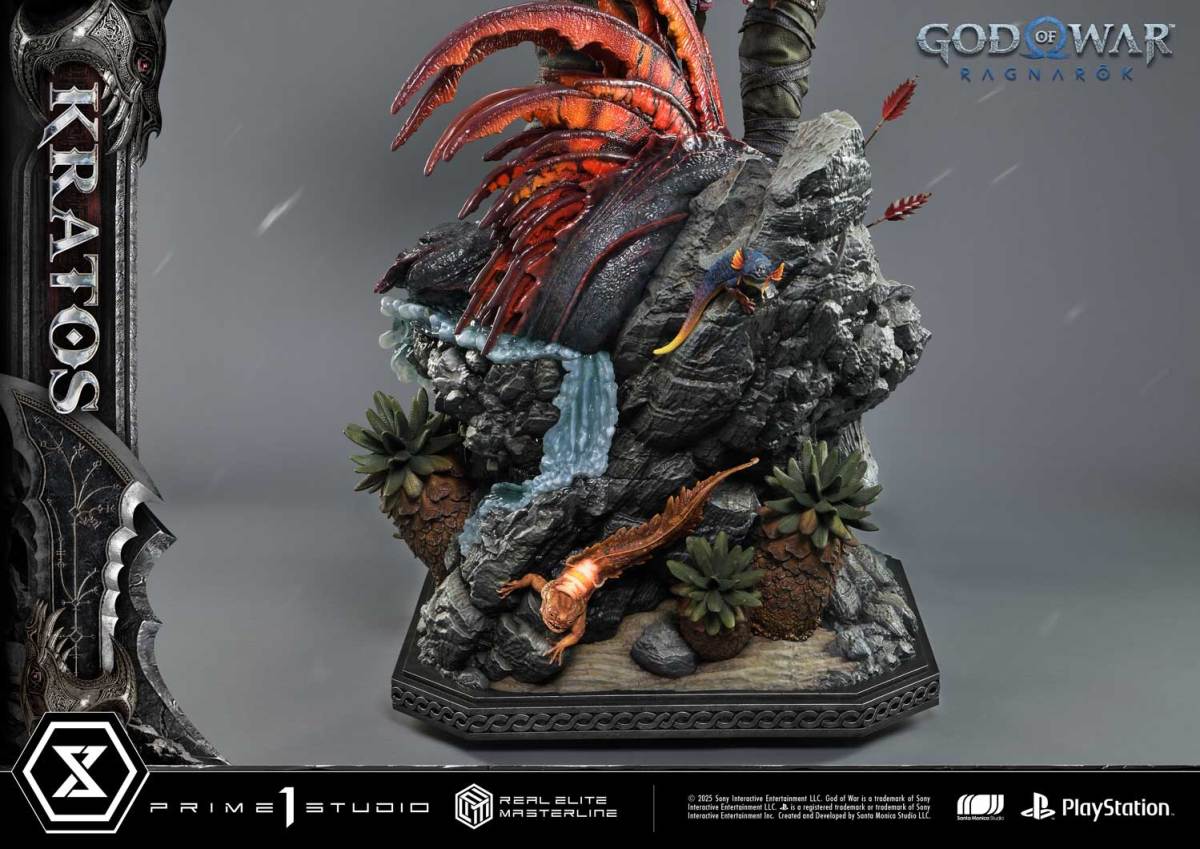 底座部分以遊戲中的北歐大地為靈感,讓克雷多斯踩在剛被擊殺的水龍身上,粗糙濕潤的皮膚紋理與炯炯有神的眼睛仿佛剛剛還在呼吸般逼真!此外也製作出了許多自然場景及生物等細節,並以彩透材質還原了濺起的水花,讓視覺上有更強烈的動態感,展現遊戲豐富迷人的世界觀!