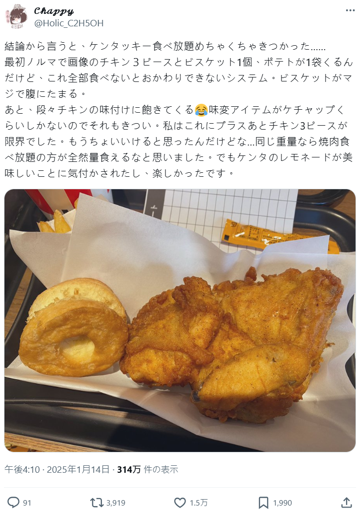 最近日本肯德基推出全國 353 家店限時「原味炸雞吃到飽」,讓許多想體驗的顧客都搶先預約嘗試,日本 X 上也開始有不少網友分享試吃心得,成為話題。