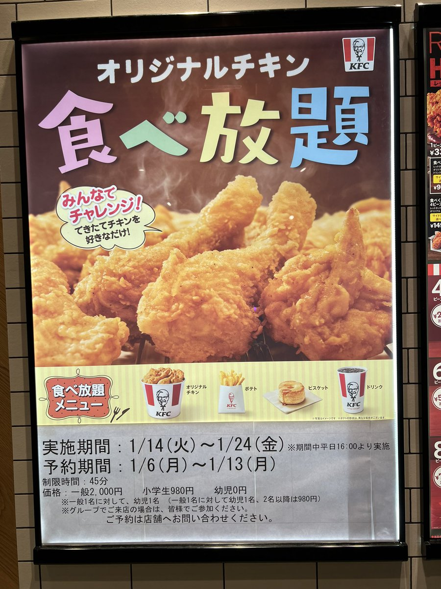 「限時原味炸雞吃到飽」在日本從 2025 年 1 月 14 日~24 日舉辦,每間店於下午四點開始,45 分鐘的限時吃到飽,採預約制。可續點的就是炸雞、比司吉、薯條跟飲料,成人要價 2,000 日圓,小學生則為 980 日圓。