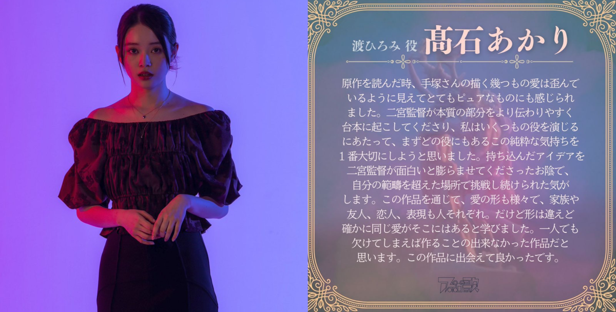 另外女主角渡廣美由高石明里飾演,表示當初閱讀原作時,感覺手塚治虫筆下的愛,雖然看似扭曲,卻是非常純粹的。二宮導演在改編時忠實傳遞了這樣的核心價值,讓我在演繹這個角色時,始終將這份純粹感放在首位。在拍攝過程中,導演也讓我的創意發揮到極致,突破了自己的演技界限,希望大家能一起收看這部詮釋愛的作品。