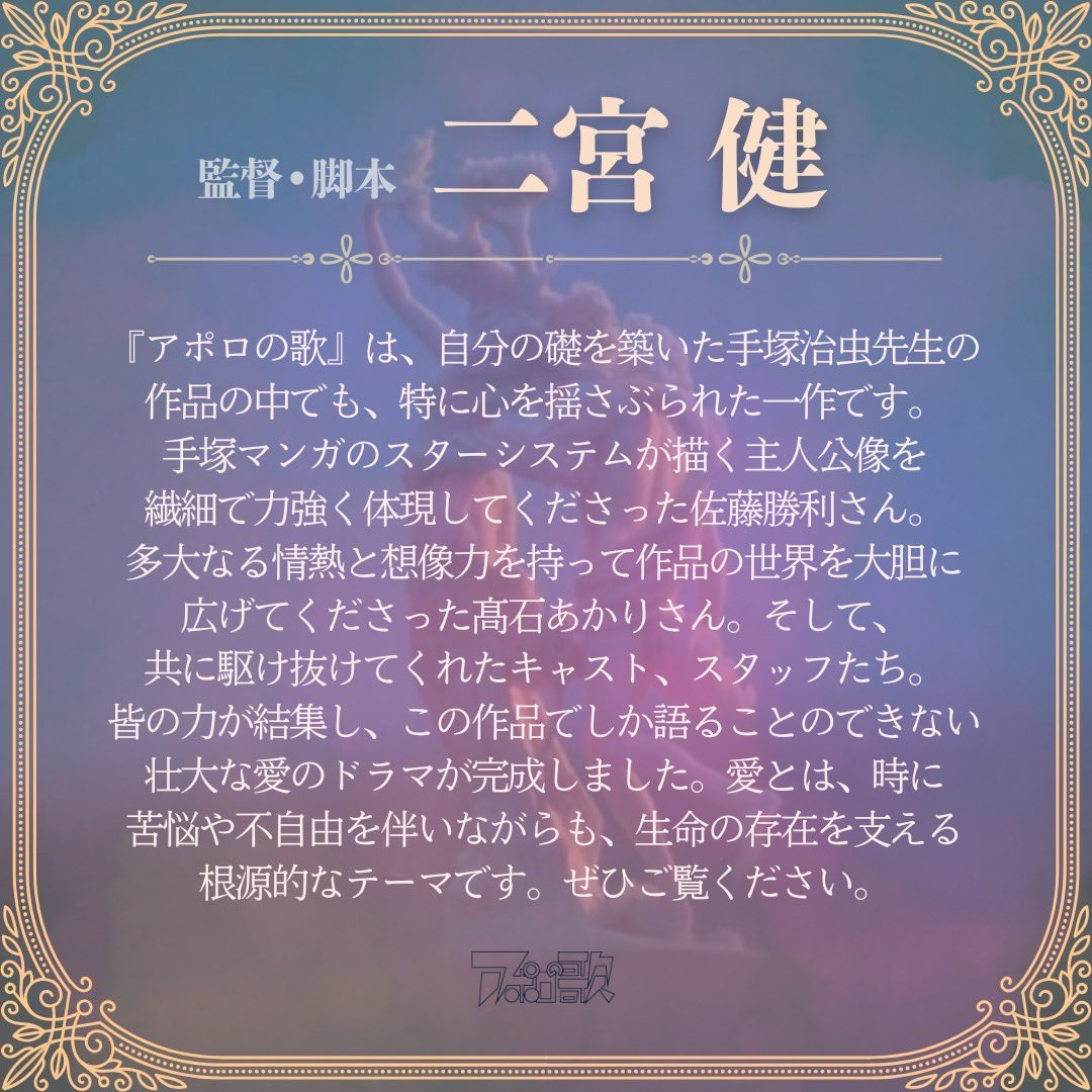 二宮健導演則指出,《阿波羅之歌》是自己心目中最具衝擊力的手塚治虫作品之一。愛,是一個既甜蜜又伴隨苦痛的不朽主題,也是支撐生命的根源。我希望這部劇能讓觀眾重新審視並思考愛的真正意義。