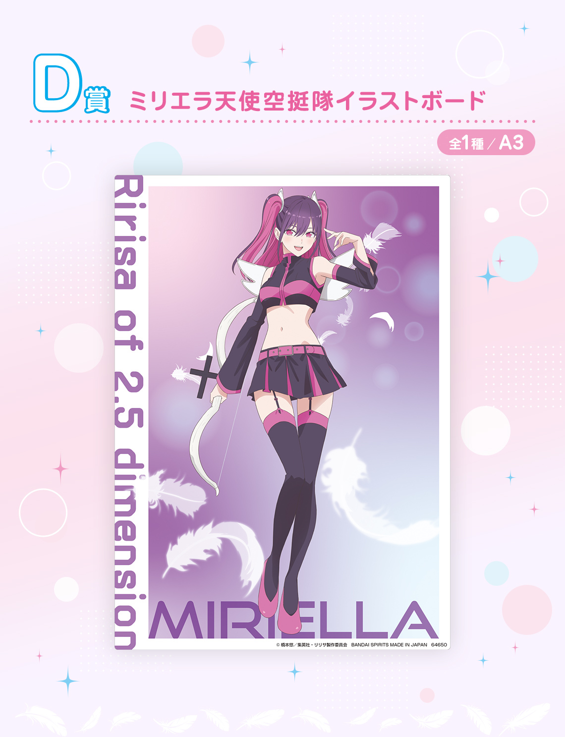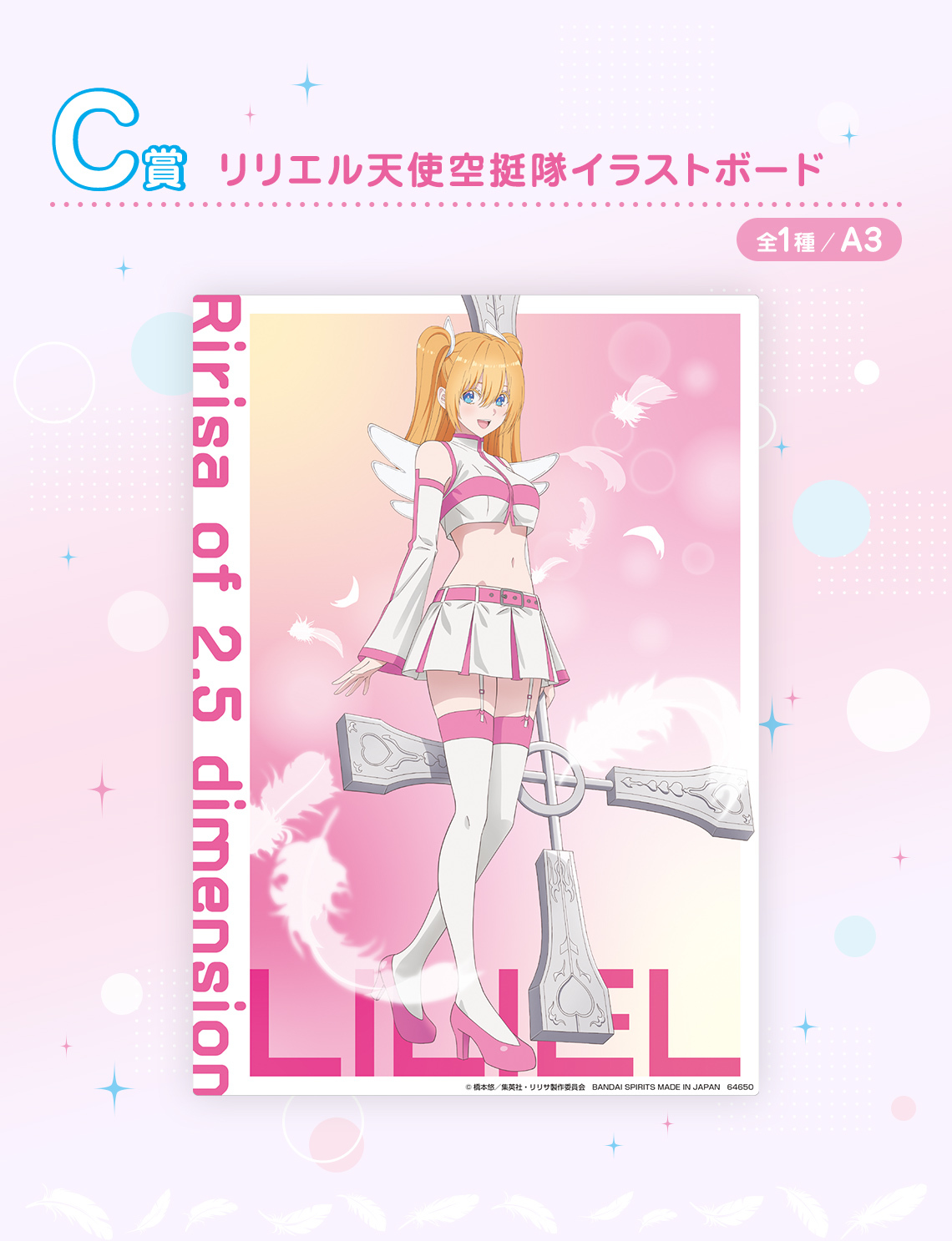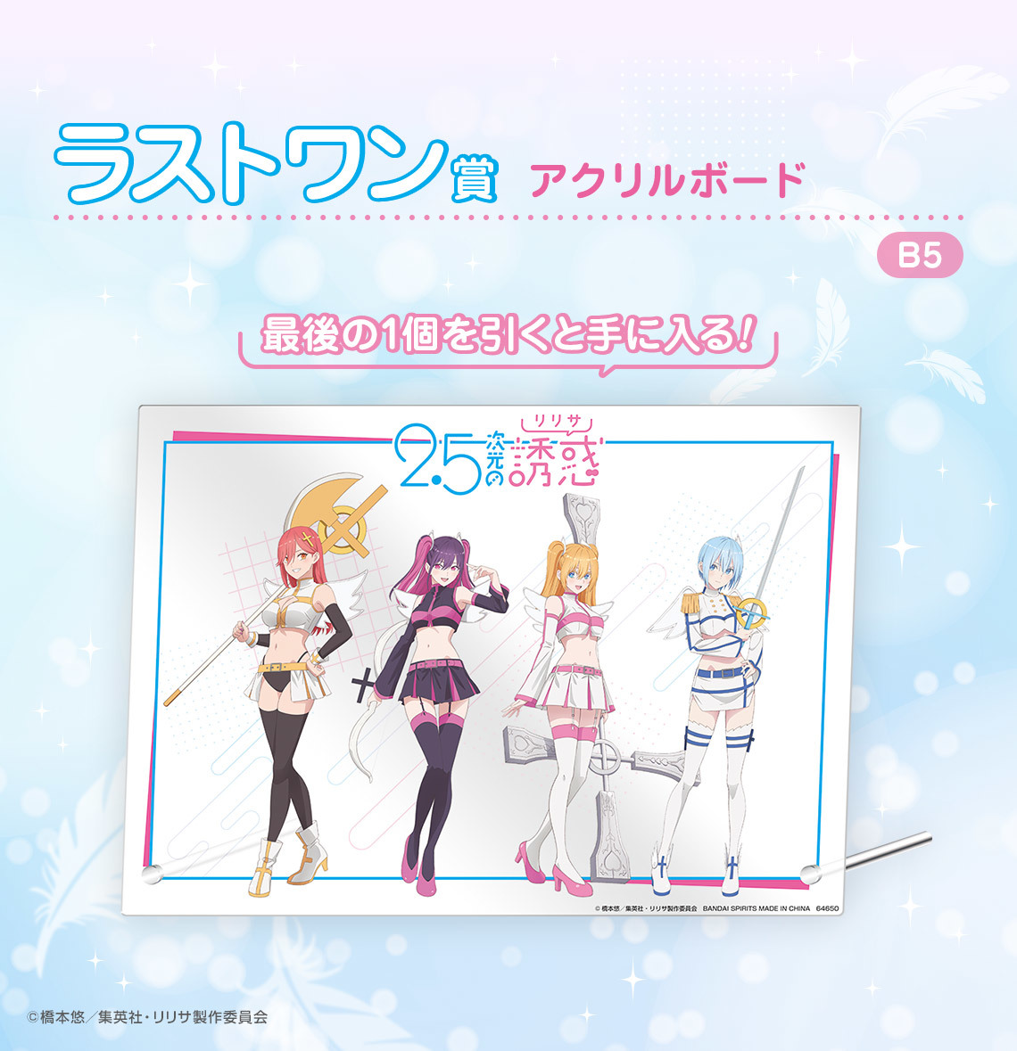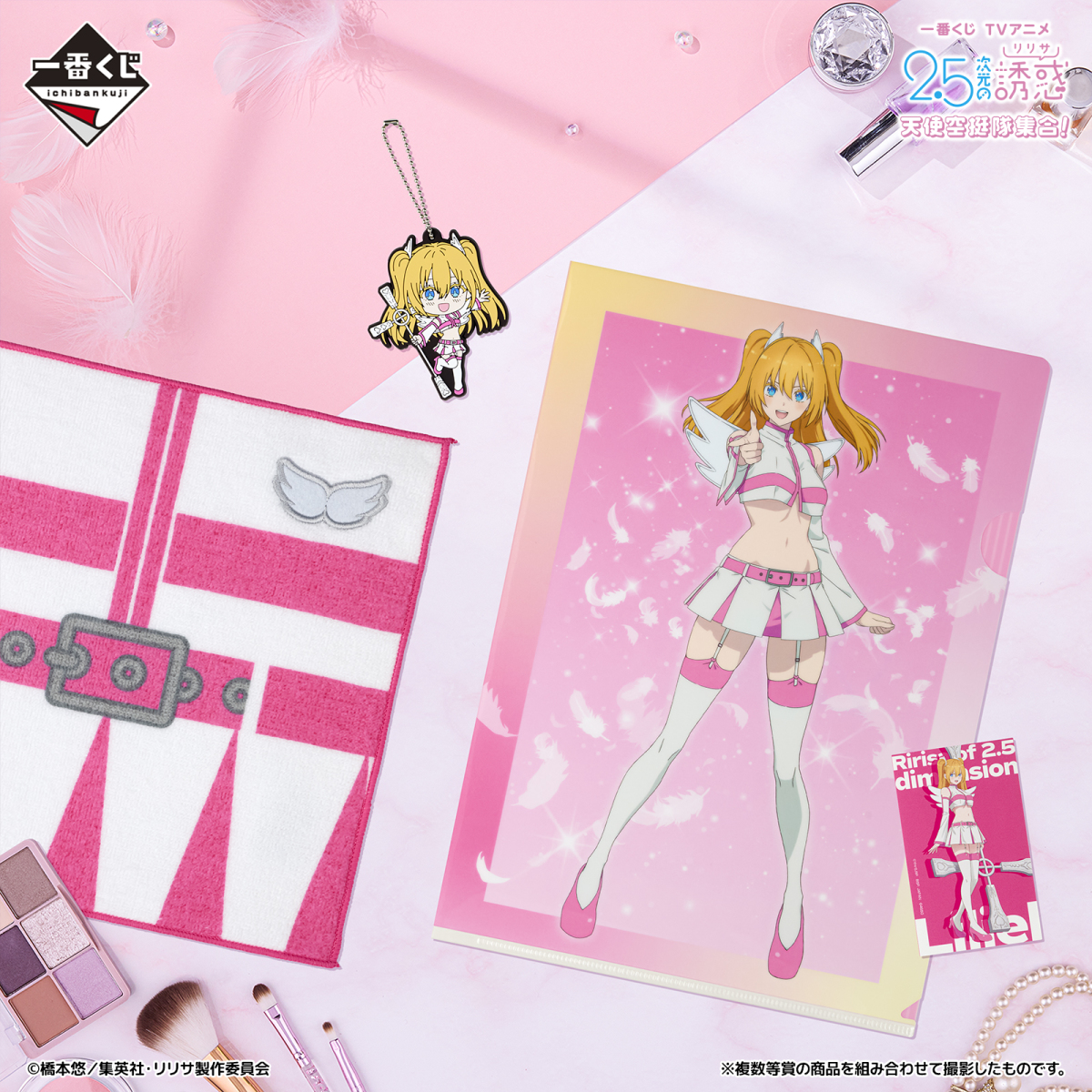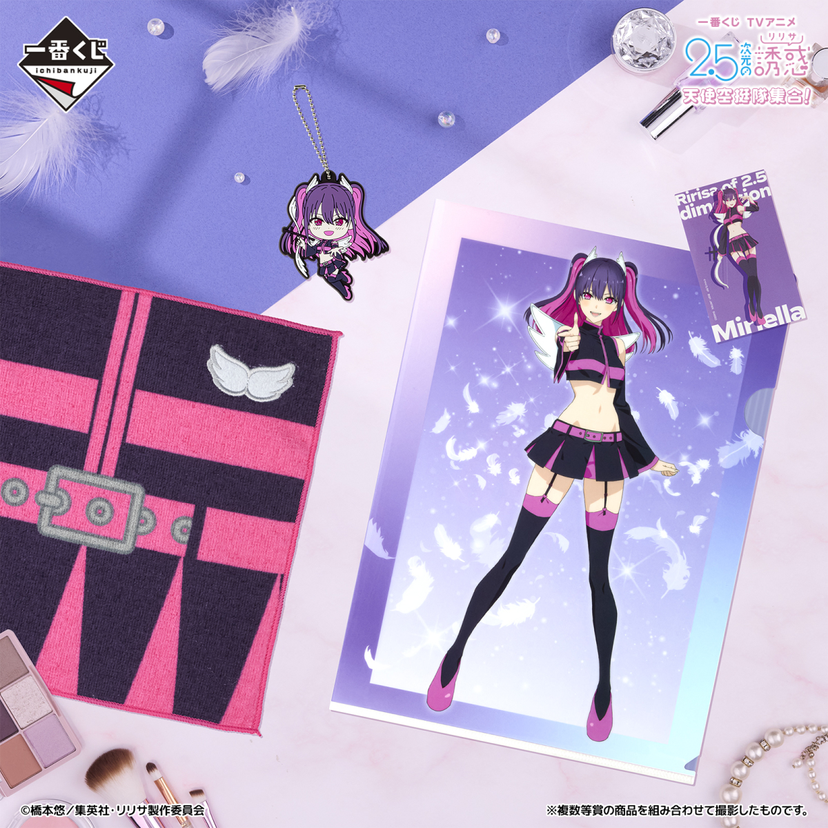 C~F 賞分別為莉莉艾露、米莉艾拉、諾基艾露及亞莉艾露的天使空挺隊插畫板,印有一番賞獨家繪製的四款角色插畫!G~J 賞為角色壓克力立牌、透明資料夾/貼紙組、橡膠吊飾和服裝造型毛巾,最後一賞則為印有四位天使空挺隊隊員的壓克力立牌,每一款賞品都印有理理沙、美花莉、乃愛和亞理亞及他們裝扮後模樣的插圖,喜歡《2.5 次元的誘惑》千萬不要錯過!