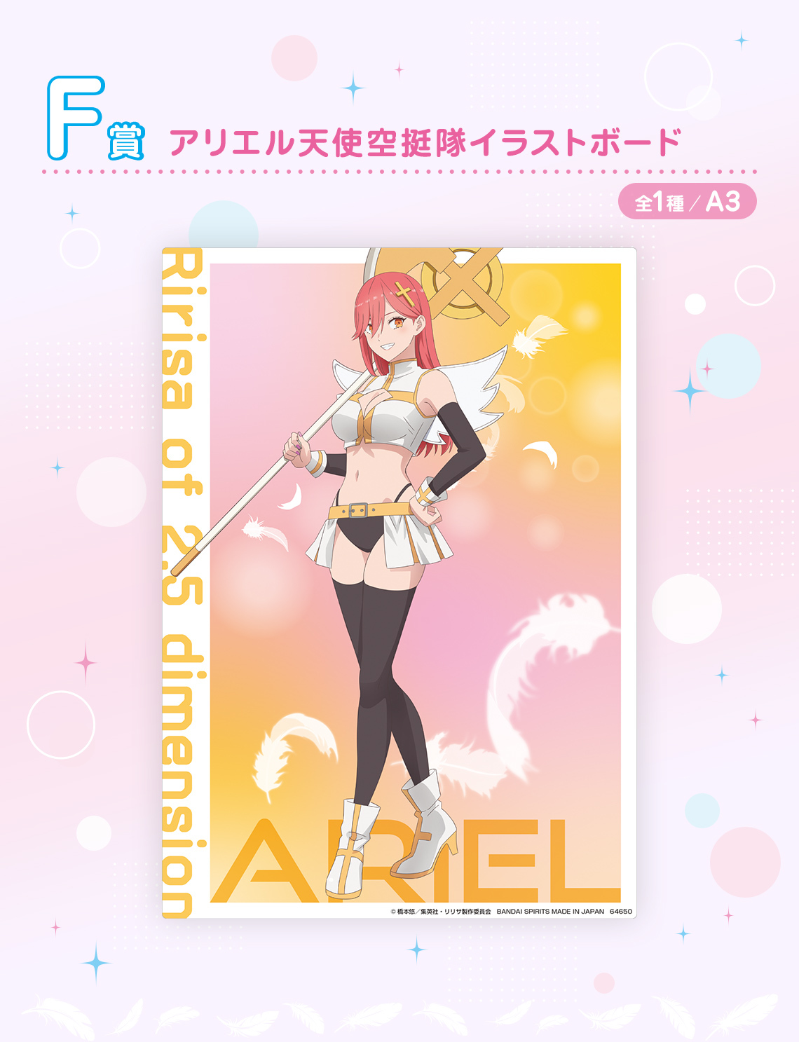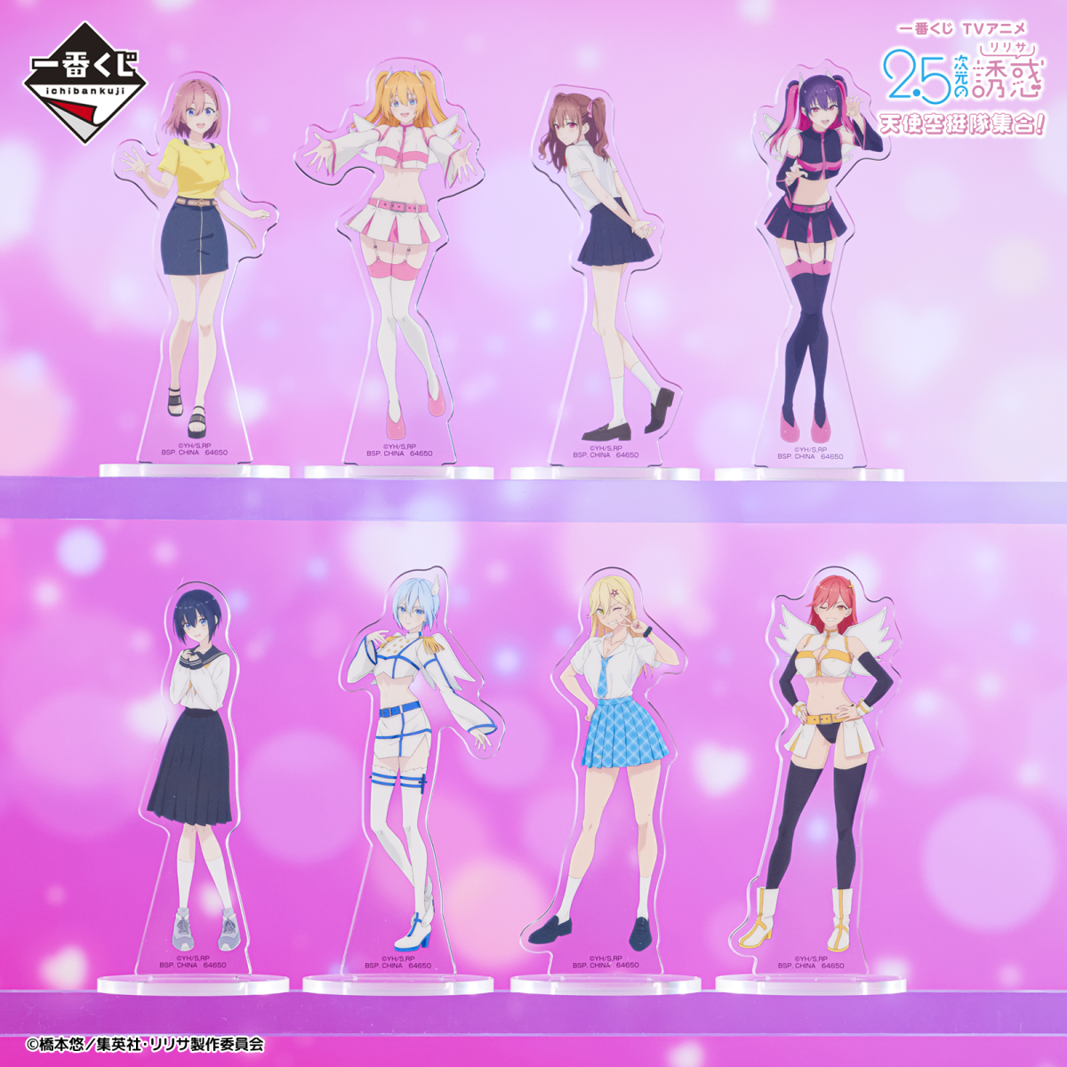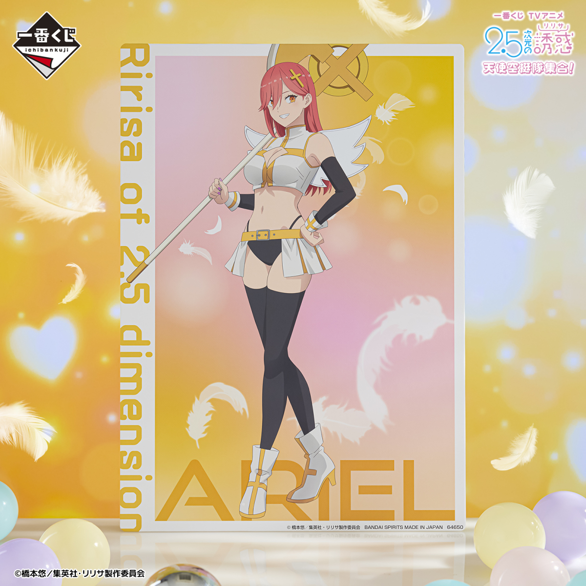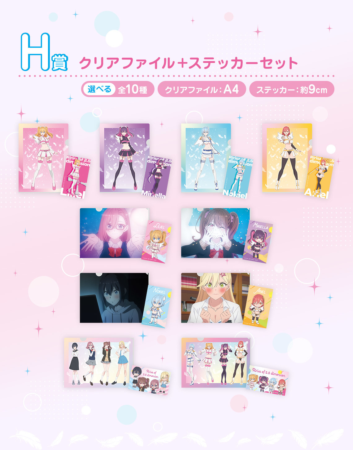 C~F 賞分別為莉莉艾露、米莉艾拉、諾基艾露及亞莉艾露的天使空挺隊插畫板,印有一番賞獨家繪製的四款角色插畫!G~J 賞為角色壓克力立牌、透明資料夾/貼紙組、橡膠吊飾和服裝造型毛巾,最後一賞則為印有四位天使空挺隊隊員的壓克力立牌,每一款賞品都印有理理沙、美花莉、乃愛和亞理亞及他們裝扮後模樣的插圖,喜歡《2.5 次元的誘惑》千萬不要錯過!