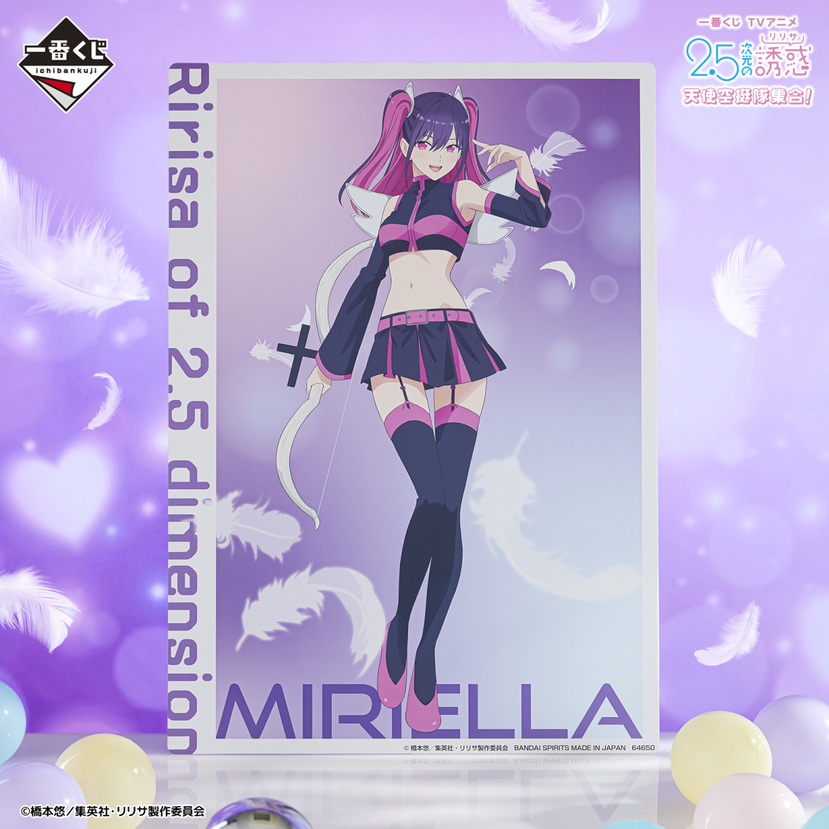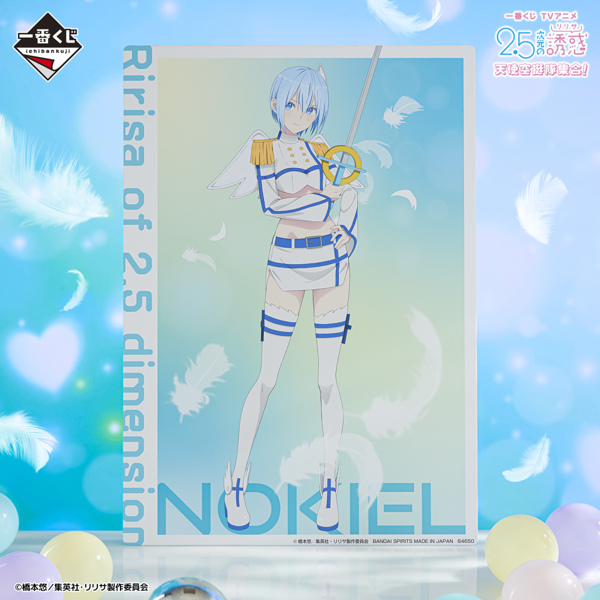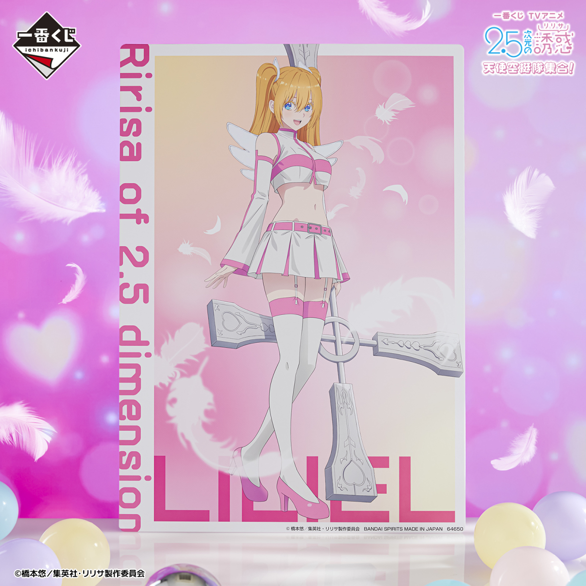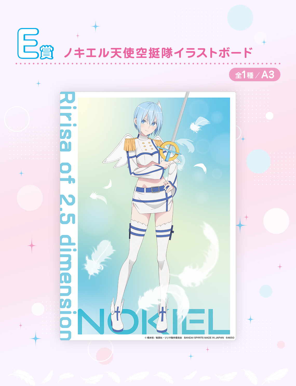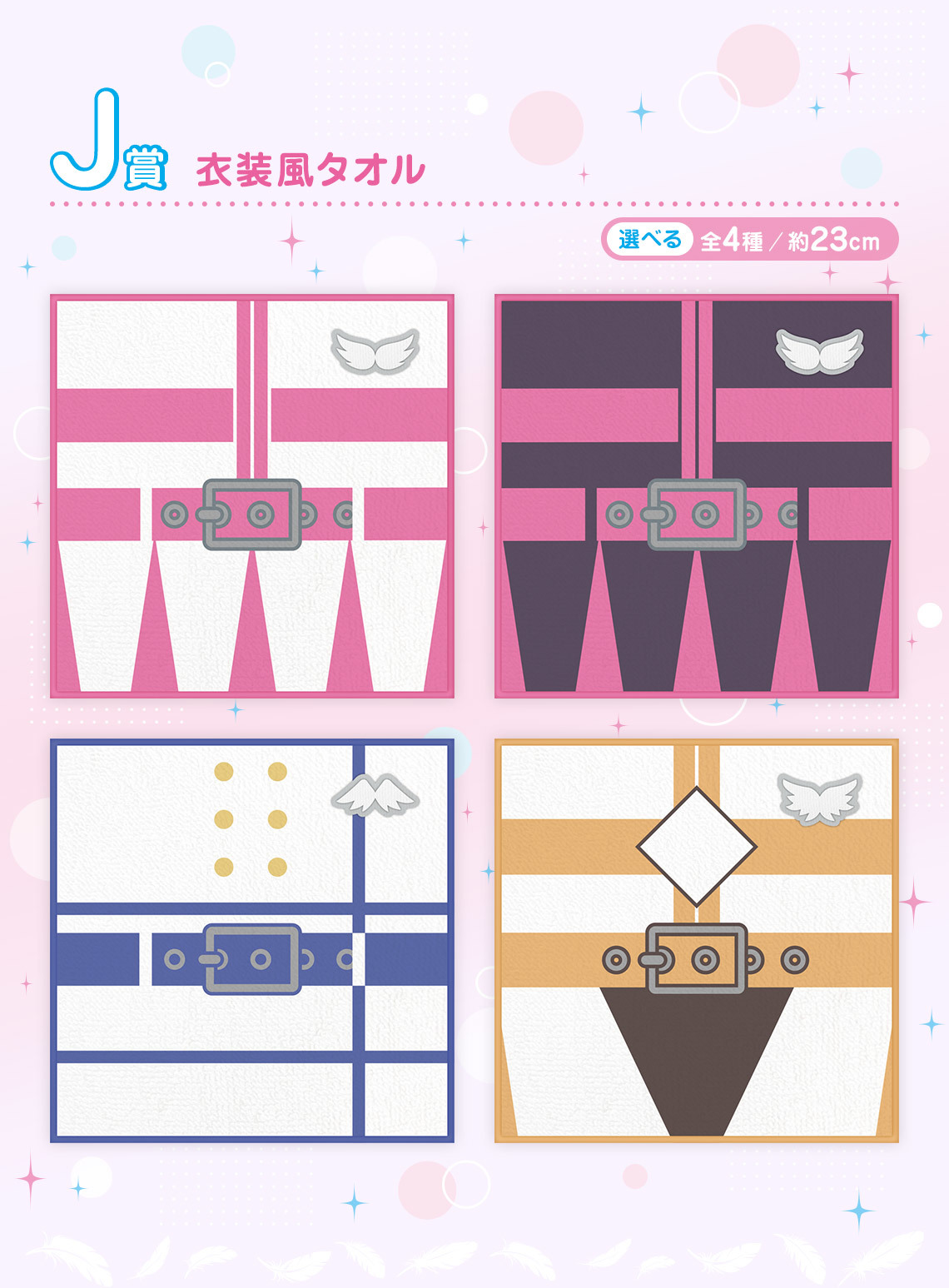 C~F 賞分別為莉莉艾露、米莉艾拉、諾基艾露及亞莉艾露的天使空挺隊插畫板,印有一番賞獨家繪製的四款角色插畫!G~J 賞為角色壓克力立牌、透明資料夾/貼紙組、橡膠吊飾和服裝造型毛巾,最後一賞則為印有四位天使空挺隊隊員的壓克力立牌,每一款賞品都印有理理沙、美花莉、乃愛和亞理亞及他們裝扮後模樣的插圖,喜歡《2.5 次元的誘惑》千萬不要錯過!