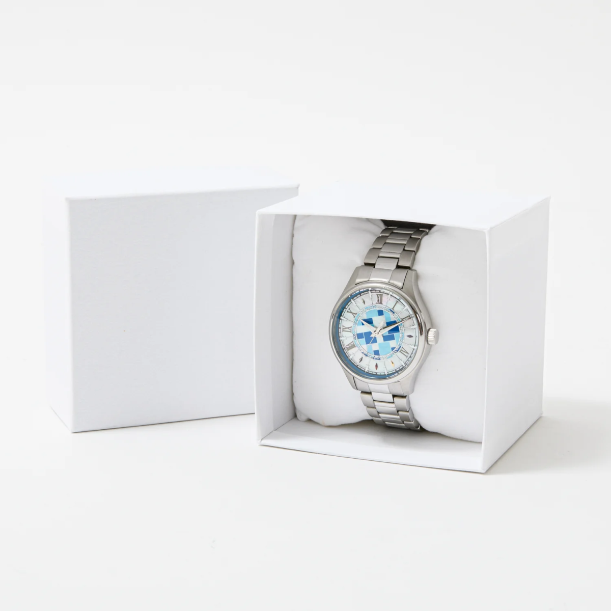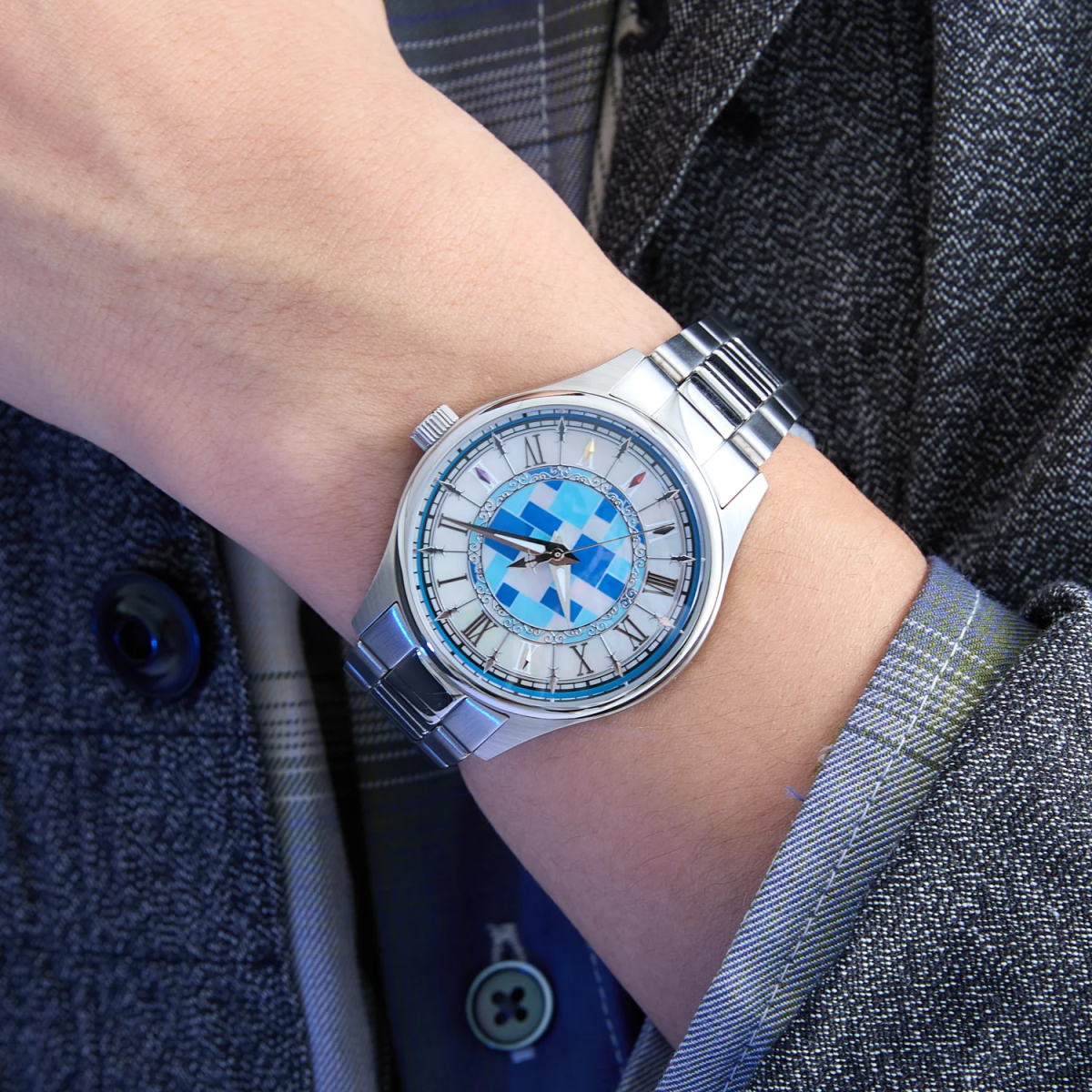 錶盤上的幾何圖案採用了貝殼材質,並用上彩海學園中學部的制服色系作為背景以幾何圖案打造。