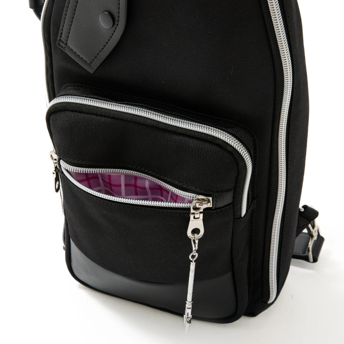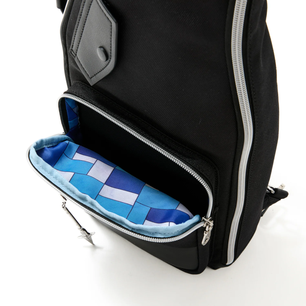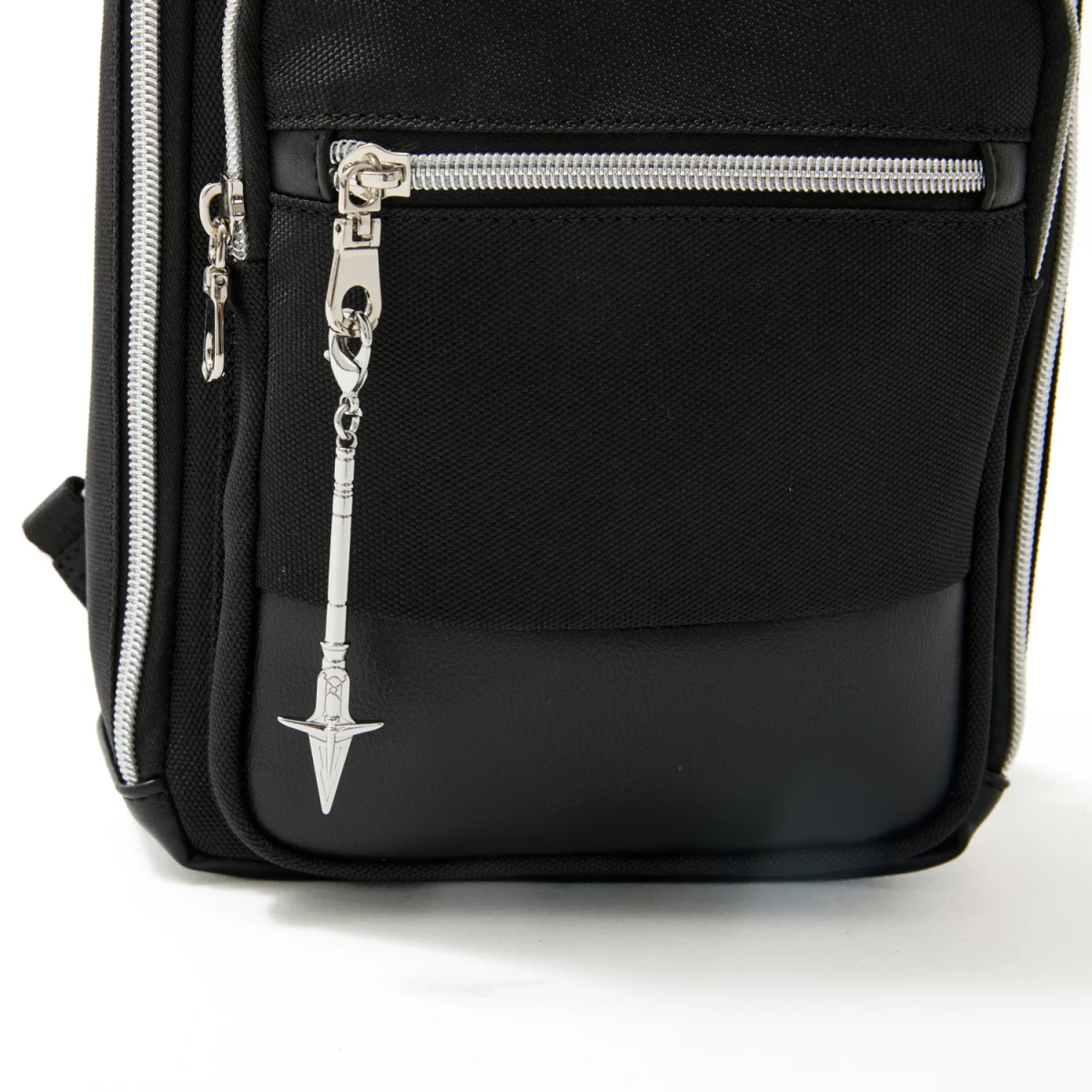 包款設計靈感來自劇中姬柊雪菜背著的吉他包,改造成日常使用更方便的斜背包。外型採用酷感十足的黑色搭配銀色金屬配件,時尚又俐落。包包拉鍊拉頭還特別設計成雪菜的武器「雪霞狼」造型!
