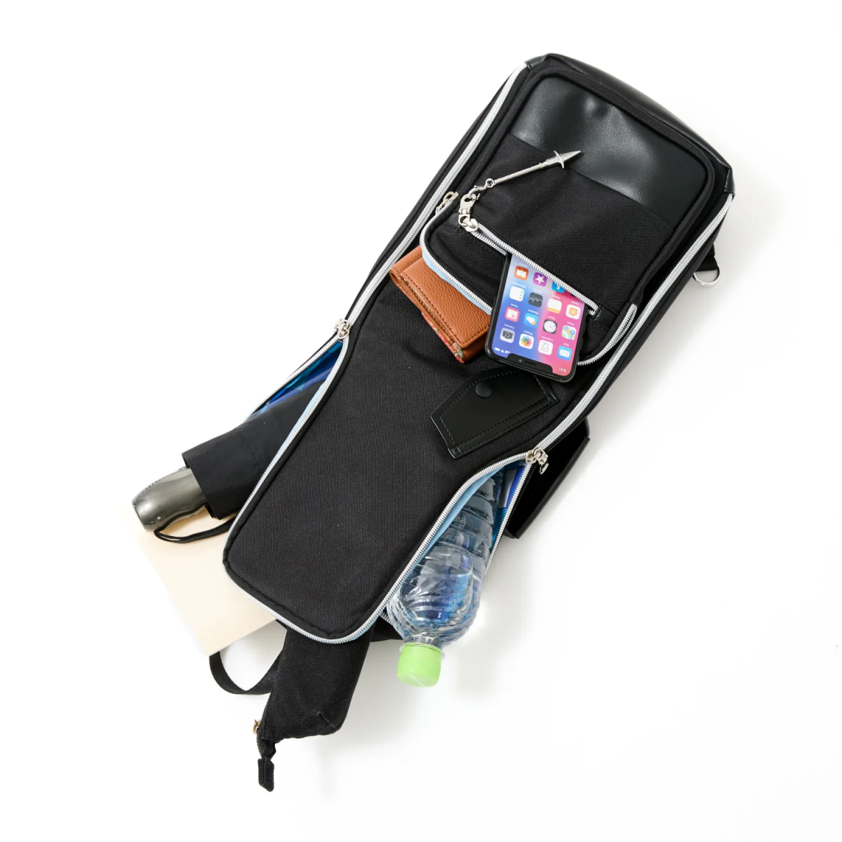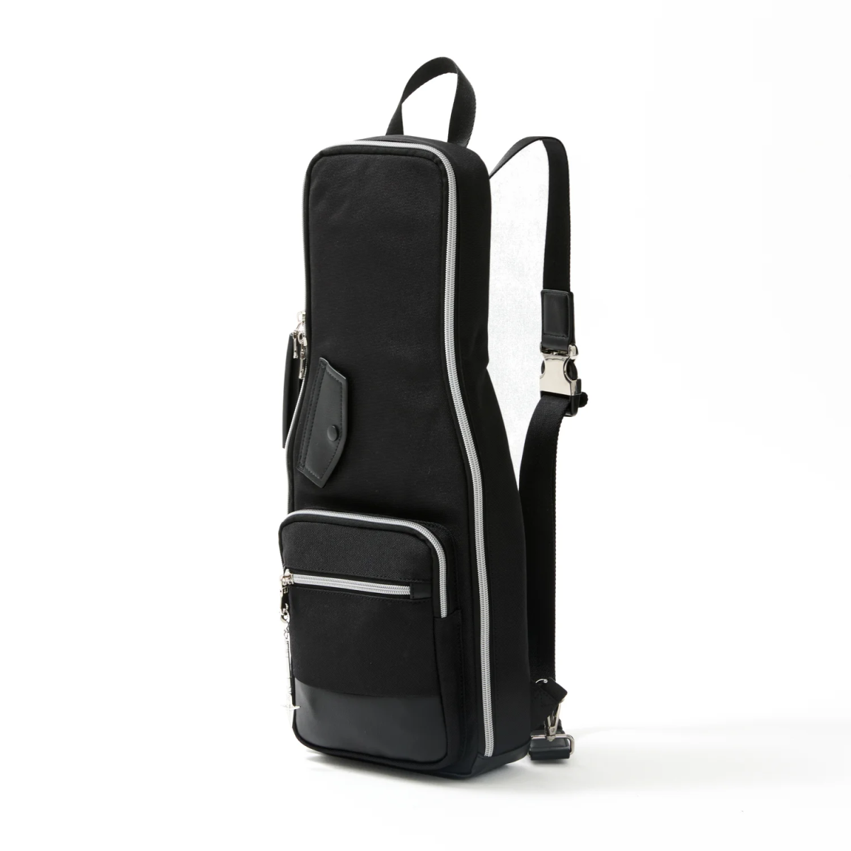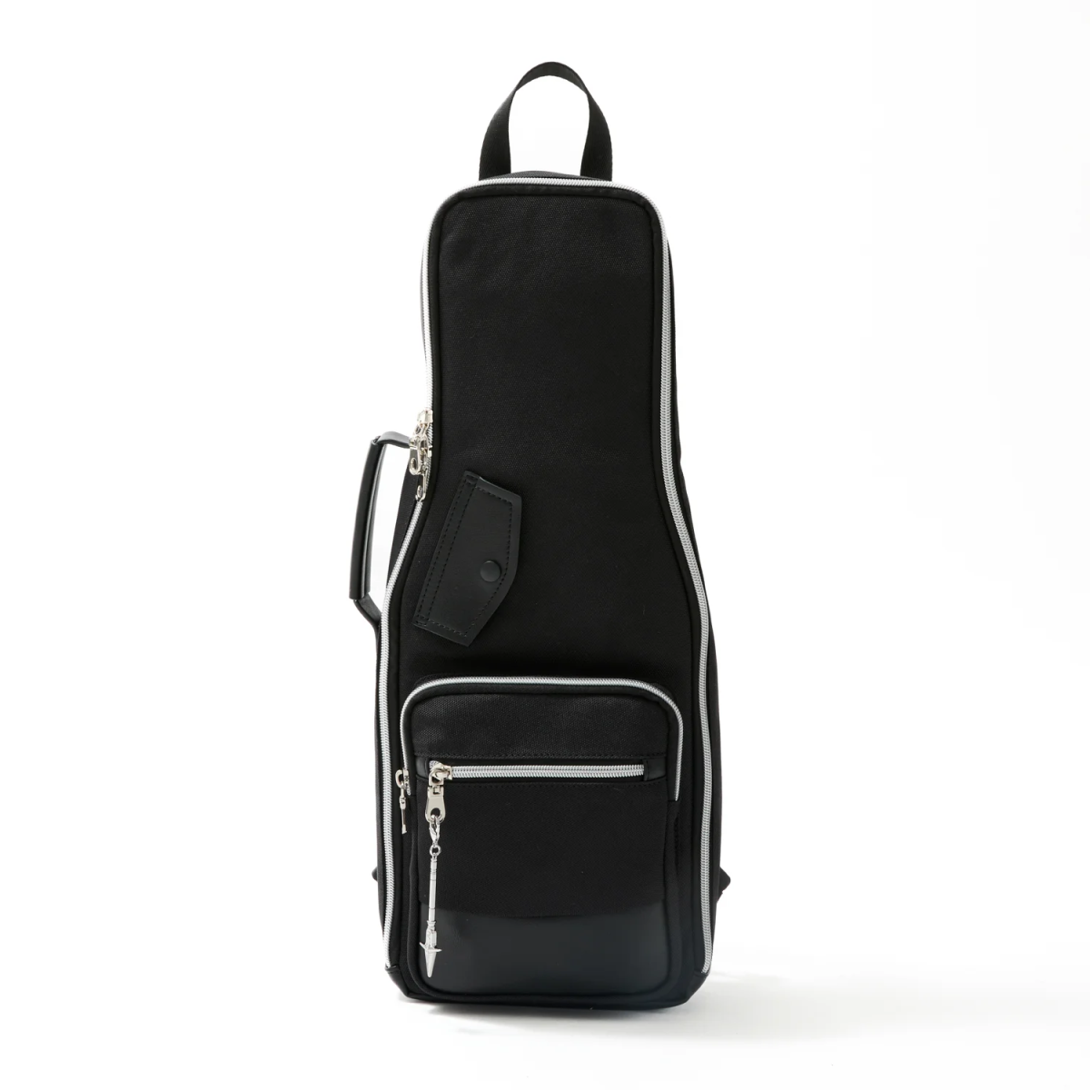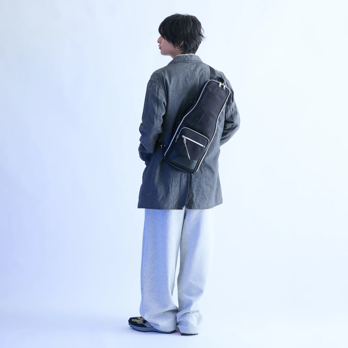 包款設計靈感來自劇中姬柊雪菜背著的吉他包,改造成日常使用更方便的斜背包。外型採用酷感十足的黑色搭配銀色金屬配件,時尚又俐落。包包拉鍊拉頭還特別設計成雪菜的武器「雪霞狼」造型!