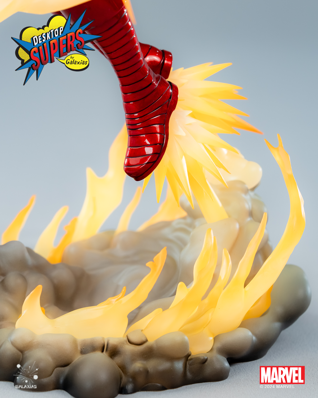 本次的 Marvel Desktop Supers 鋼鐵人(經典版)高約 29.5 公分,以鋼鐵人經典的漫畫造型打造,製作出他噴射飛起的姿態,雕刻還原漫畫中鎧甲圓潤的造型細節,並以珠光搭配亮面漆呈現出鎧甲光滑的金屬質感!而視覺上最讓人驚艷的絕對是以漸層的半透明材質打造的大份量推進火焰及煙霧特效,精緻的比例巧妙的將本體撐起,騰空飛行的模樣散發強大魄力!