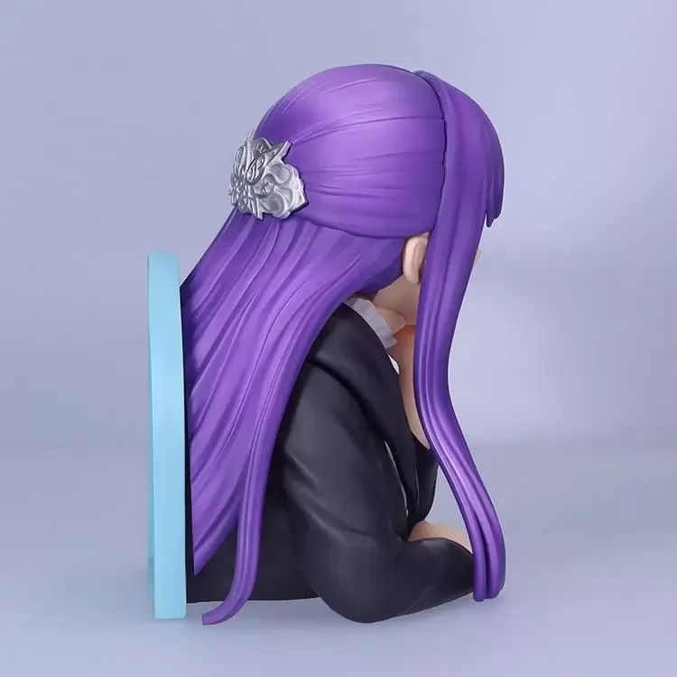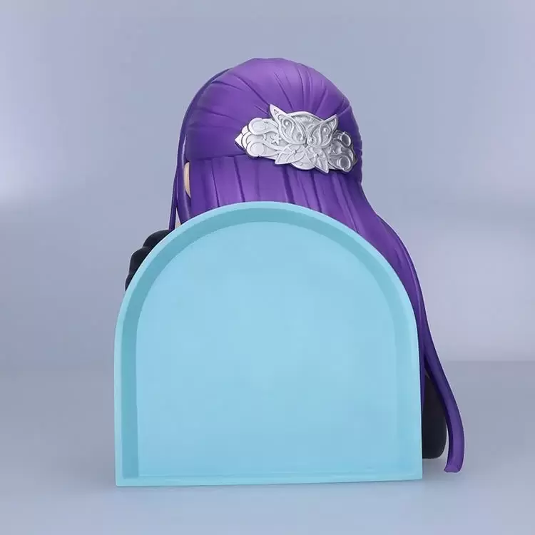 BANPRESTO景品「托腮半身胸像-費倫(暫名)」,以高約 12 公分的份量尺寸呈現出半身的造型,輕輕拂著下巴的姿勢相當優雅,搭配臉上淡淡的笑容,迷人又可愛!白色的高領連身服在只有一半的情況下,也能感受到豐滿~紫色長髮自然傾瀉而下,背後的髮飾也精緻刻劃。背景是簡單的粉藍色背板,作為書擋或是貼著牆面擺飾,展現出不一樣的感覺!