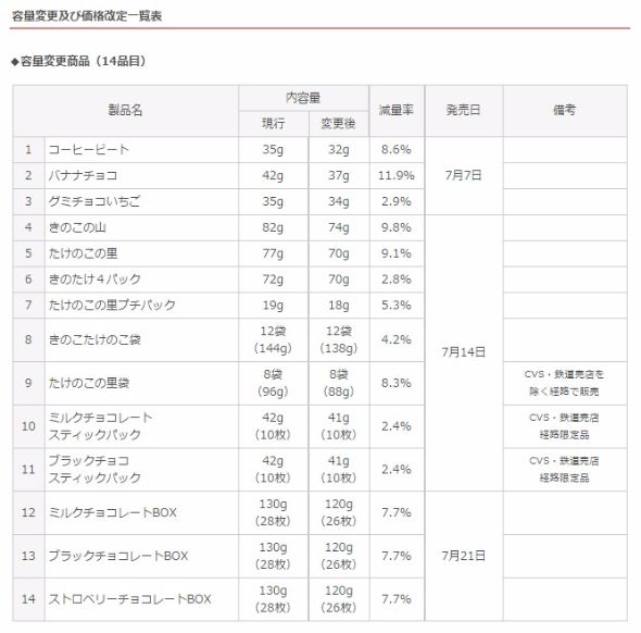 根據對應的商品,有部分為漲價部分為減量,重點的「蘑菇山」與「竹筍里」則是減少容量,約為原先分量的一成,將自 5 月 20 日後正式執行。