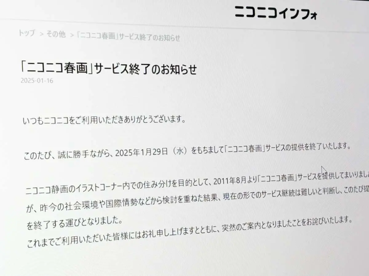 昨日 ( 1/16 ) 官方宣布,旗下 R-15 插圖平台「Niconico春畫」宣布正式結束服務,停止服務的原因是基於「近期的社會環境與國際情勢考量」,經過多方討論後的決定。