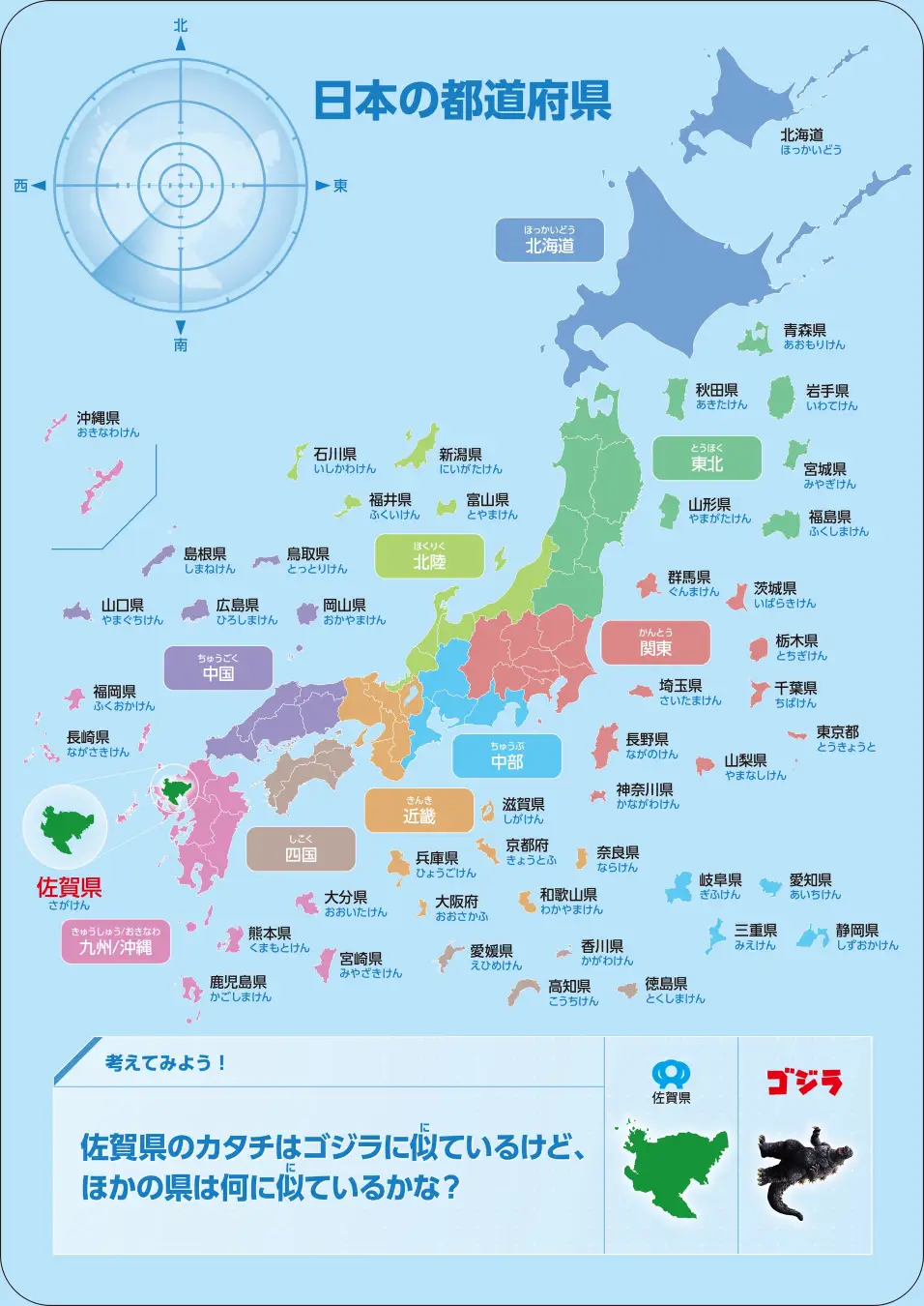 這款塑膠墊上印有日本地圖,不僅可以幫助孩子記住47個都道府縣的位置與名稱,還特別將各縣的輪廓設計得一目了然。透過「佐賀像哥吉拉」的概念,孩子們也可以動腦想想其他都道府縣的形狀像什麼。這不僅激發發想力與創造力,還讓學習變得更加有趣。