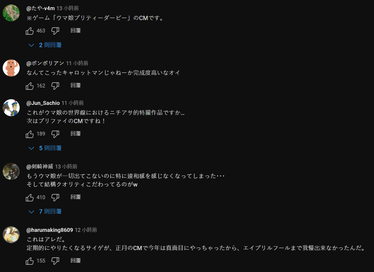而這次,這位出現在設定中的英雄真的被拍成特攝實寫版登場,在廣告的結尾之前,完全沒有出現任何《賽馬娘》的角色,因此還特別加註了一行文字說明:「※這是遊戲《賽馬娘 Pretty Derby》的廣告」,讓不少粉絲大笑不已,馬娘的廣告總是如此胡鬧又有趣。