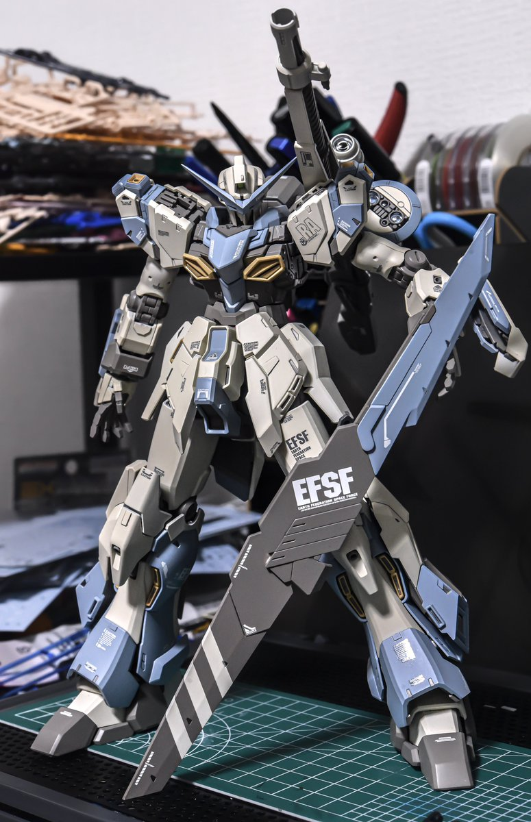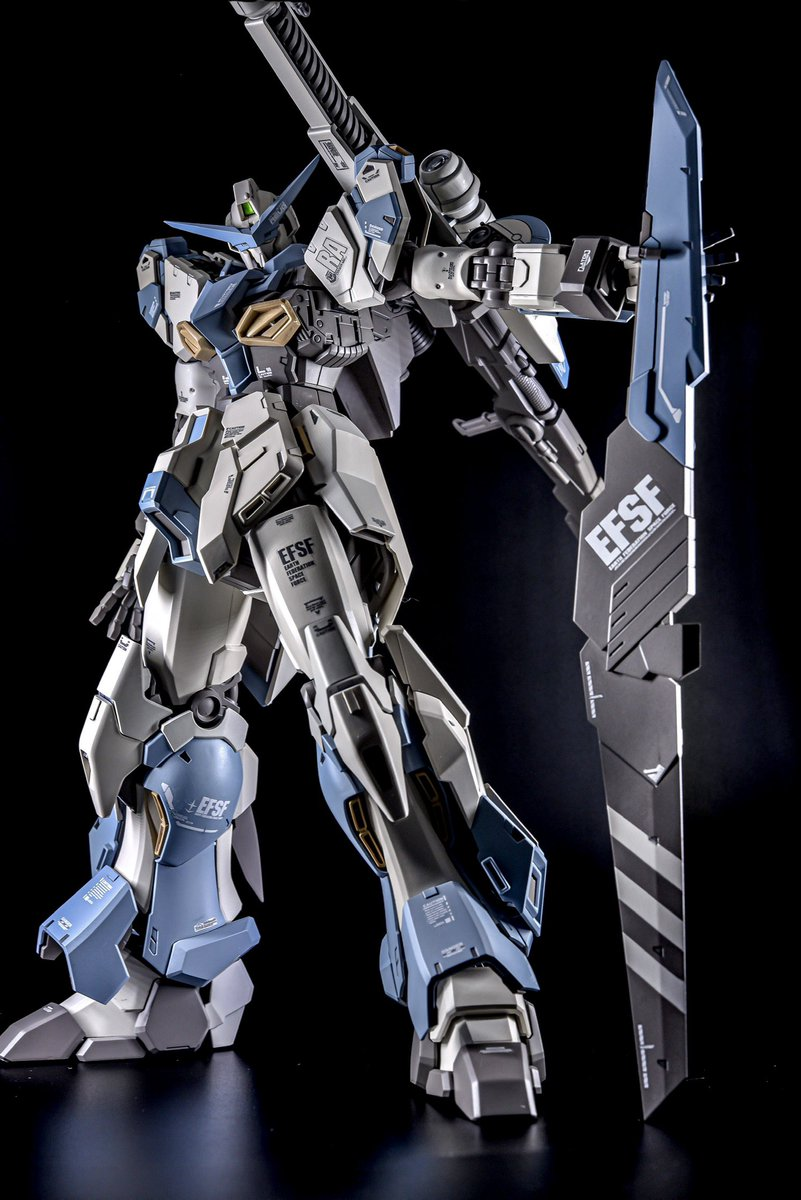 推主 puras 使用的基礎模型是「MG 1/100 新安州原石型 (鋼彈NT Ver.) Ver.Ka」,這是由聯邦軍主導開發,但後來被吉翁殘黨強奪的機體。