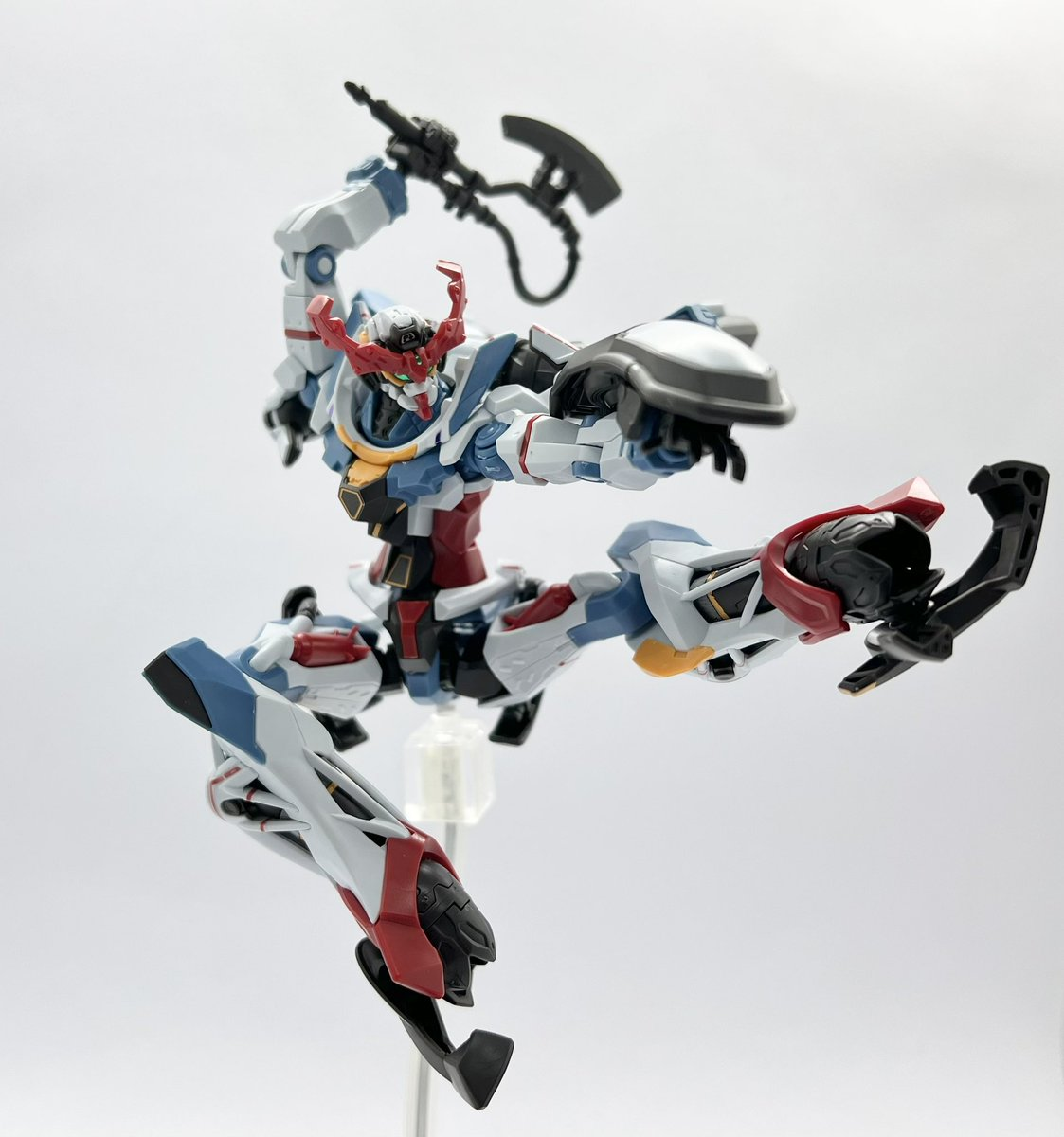 這次『HG 1/144 GQuuuuuuX』最讓人驚豔的就是髖關節與腰部的部分可動性之高,甚至上下半身是可以對折的,搭配髖關節的球形關節操作,幾乎是任何腿部動作都可以輕鬆實現,把玩度可說是極高。