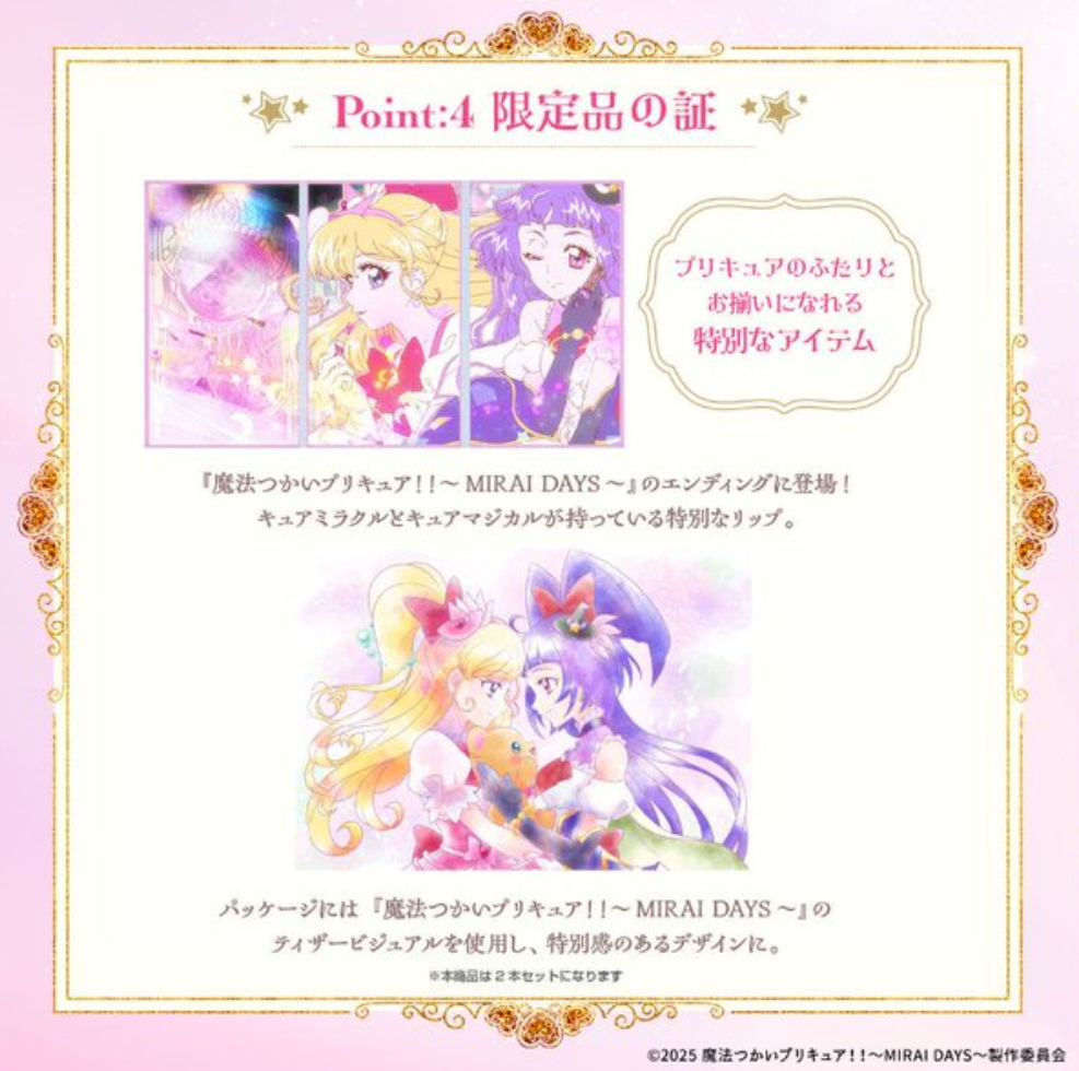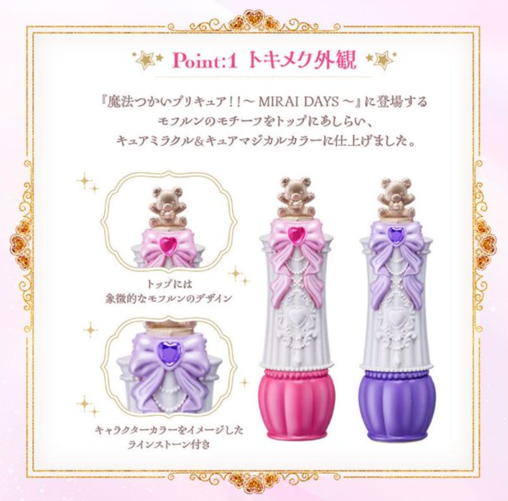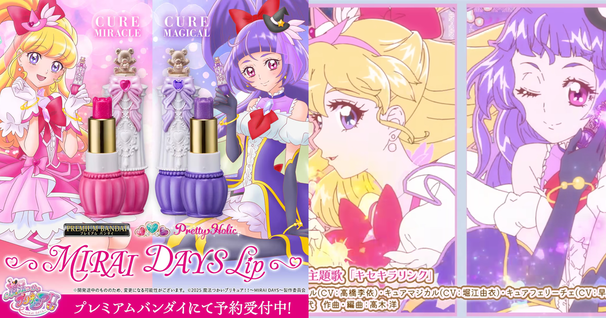 日本玩具廠牌萬代近期也推出了動畫片尾曲 ED 中的同款彩妝產品「Pretty Holic ~MIRAI DAYS Lip~」唇膏。售價為 4,950 日圓,可於日本萬代 PB 網站預購。