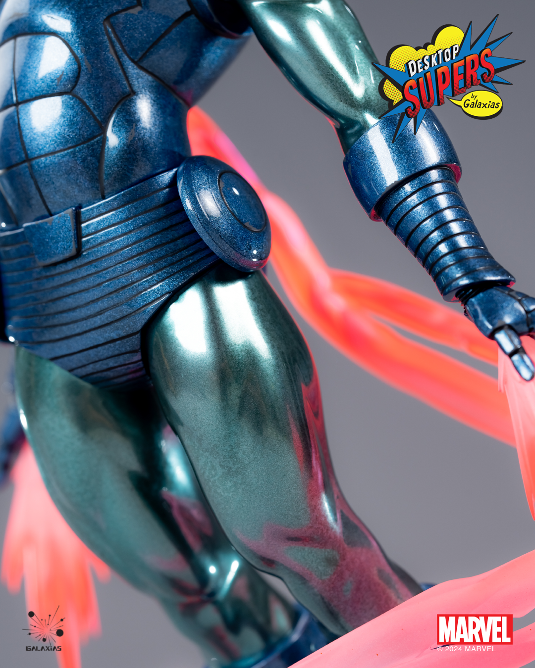 本次同步登場的 Marvel Desktop Supers 鋼鐵人(匿蹤版)高度同樣是約 29.5 公分,採用與經典版相同的模型,在經典漫畫圓潤的鋼鐵裝甲上改以匿蹤裝甲標誌的青藍色塗裝,珠光搭配亮面漆色的呈現讓藍色的裝甲閃耀像是反射星空般的光澤,支撐本體的大份量推進火焰及煙霧特效也改為匿蹤裝甲的紅色火焰,低調沈穩的用色讓他看起來像是在暗夜中靜靜飛起,提供與經典版截然不同的視覺享受!