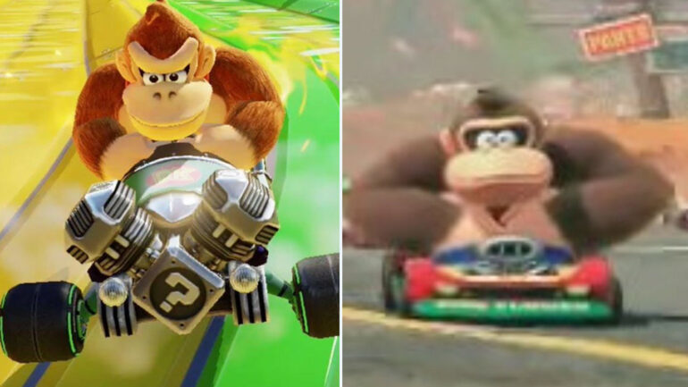 而角色設計部分,特別是在「咚奇剛」的造型有了明顯的改動,過去在《瑪利歐賽車》中的形象,通常是沿用任天堂其他遊戲的經典設計,但這次的大金剛顯得更加卡通化,表情更加誇張,甚至帶有一絲滑稽幽默的氛圍,因此這也讓玩家對其他角色的潛在變化感到十分好奇。