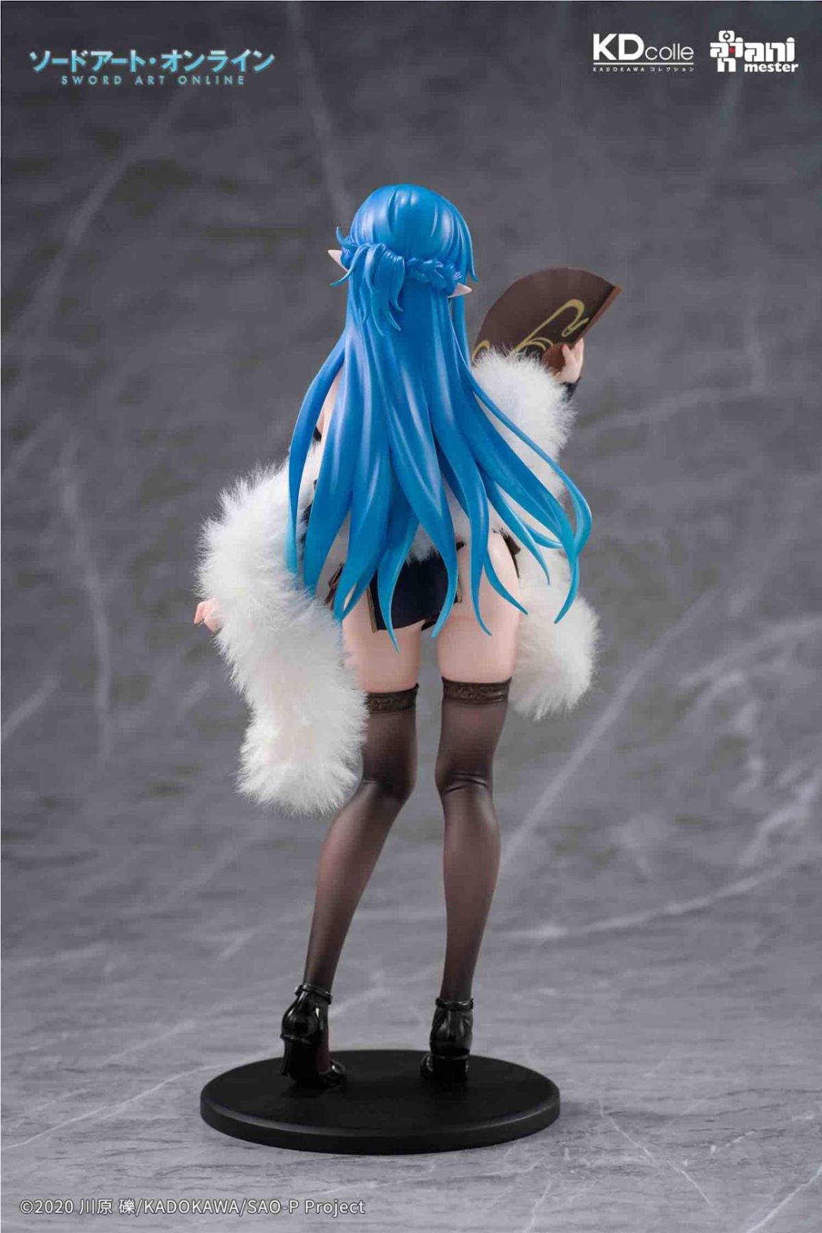 「亞絲娜 水精靈 旗袍Ver.」1/7比例模型,尺寸約高 23 公分,將水精靈姿態的亞絲娜以身穿旗袍之姿登場。臉上掛著魅惑的笑容,並精心刻劃出優美的鑲金邊旗袍,在深黑紫的布料中隱隱透出膚色,更顯白皙與性感;緊緊勾勒出凹凸有致的身體曲線、腹部與肚臍等貼身線條也不可錯過!附有可自由拆裝的白色皮草(白毛),替整體增添一絲溫暖與奢華感。