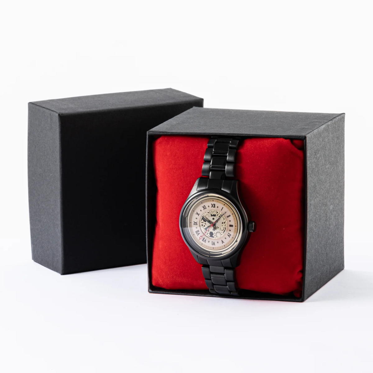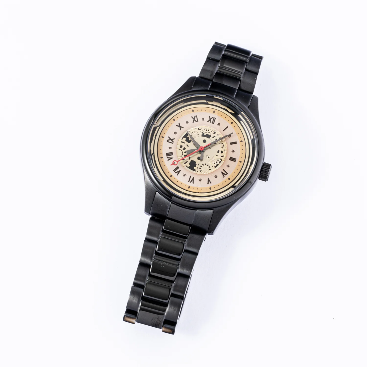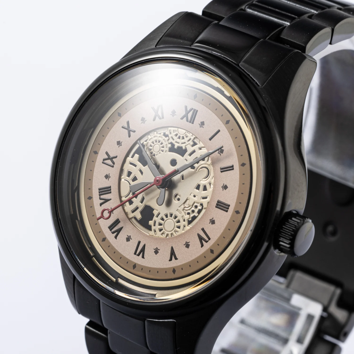 錶盤設計靈感來自她的天使〈刻刻帝〉,不僅重現了刻刻帝的細節,錶盤中心還加入了齒輪的元素,透過多層結構與多種工藝的立體效果呈現。時、分針的設計則取材自狂三愛用的雙槍:長針模擬步槍的輪廓,短針則是手槍的造型,秒針則選用狂三標誌性的鮮紅色。