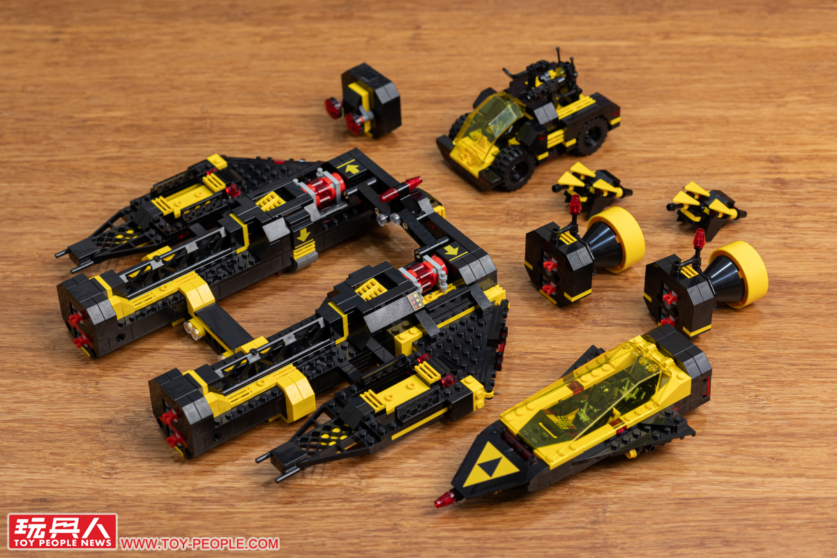 ▼ 我們看看藉著共通卡榫可以安裝/拆解的部件有哪些吧!除了 Blacktron Renegade 這艘太空梭的骨幹之外,還有一個雙人座的駕駛艙、一台星際探測車、一個通訊器、兩個搭載飛翼的太空飛車,以及兩個引擎能源罐(engine energy canister)。